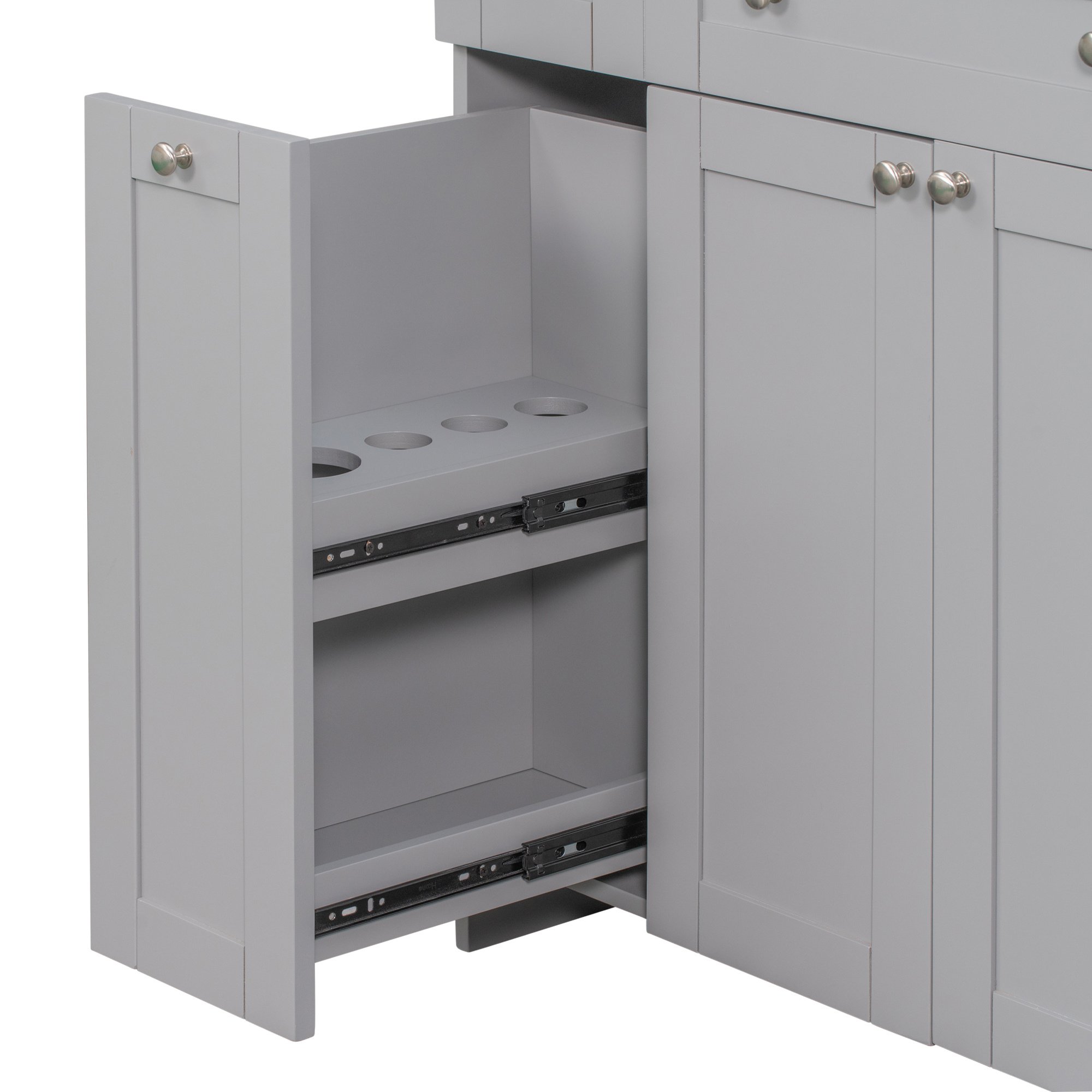 This gray freestanding bathroom cabinet is versatile and timeless. The main materials are solid wood and MDF. It is equipped with a resin integrated basin sink; which is easy to clean. What is even more worthy of praise is its abundant storage space. The high drawer on the left can store all bathroom appliances such as hair dryer; curling iron; and bath products such as shampoo. The two soft-closing cabinet doors on the right can store bath towels and other necessities; so that your bathroom will will be clean and tidy.