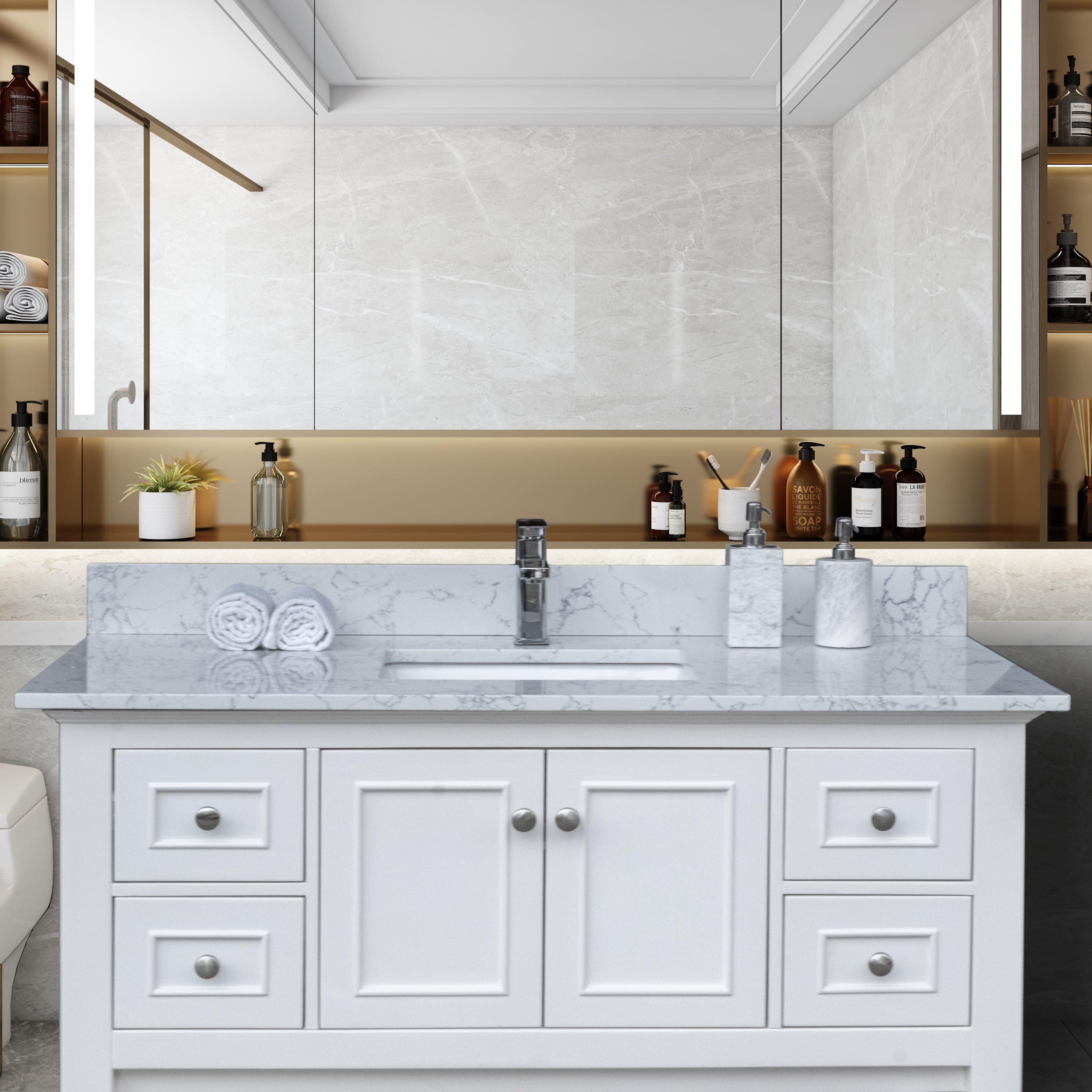 1.Warmly elegant and stylish Carrara marble vanity top complement most Bathroom designs and coordinate with both light and dark cabinetry High-end and classic natural stone top Pre-sealed and Polished for added protection