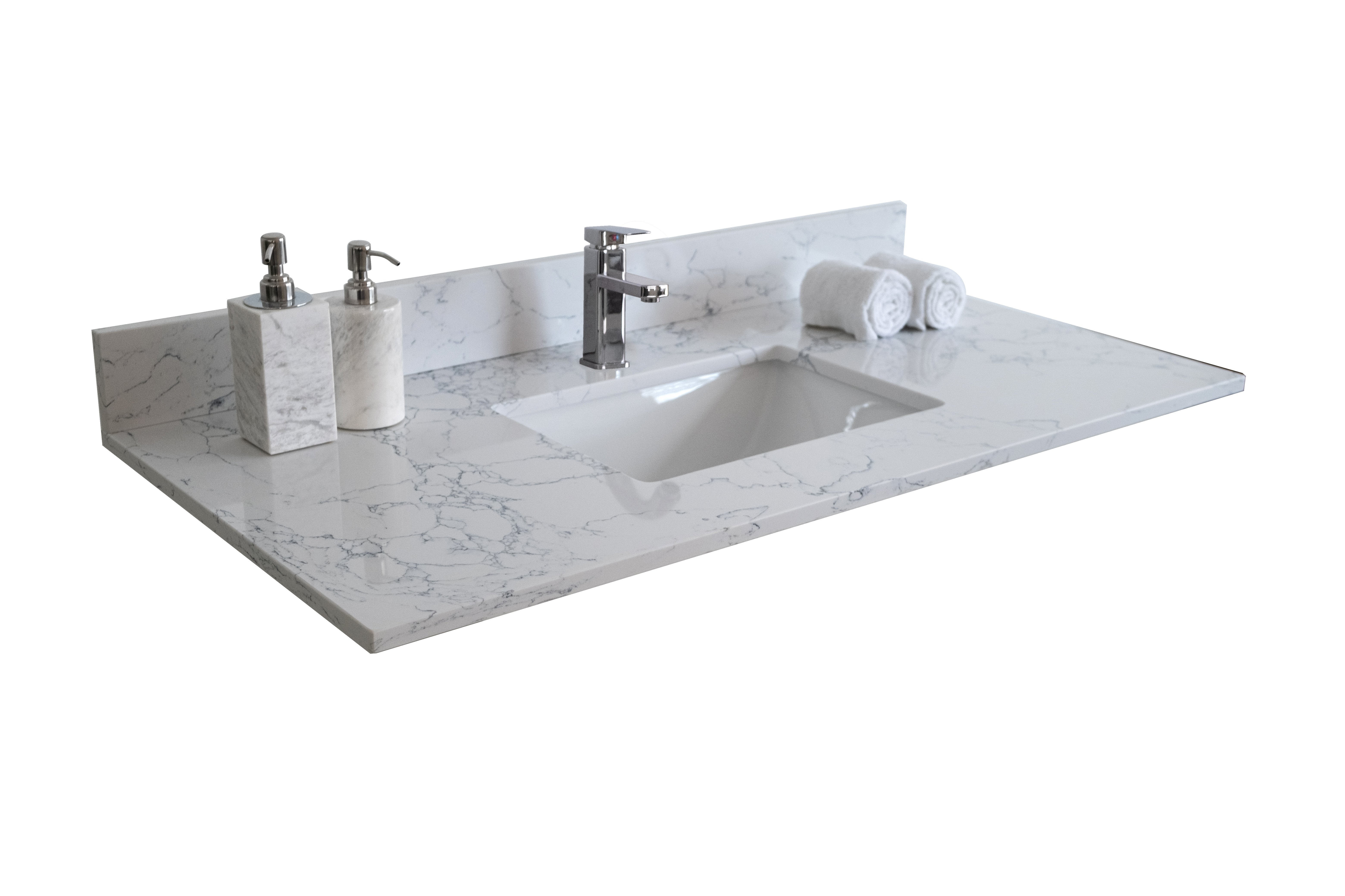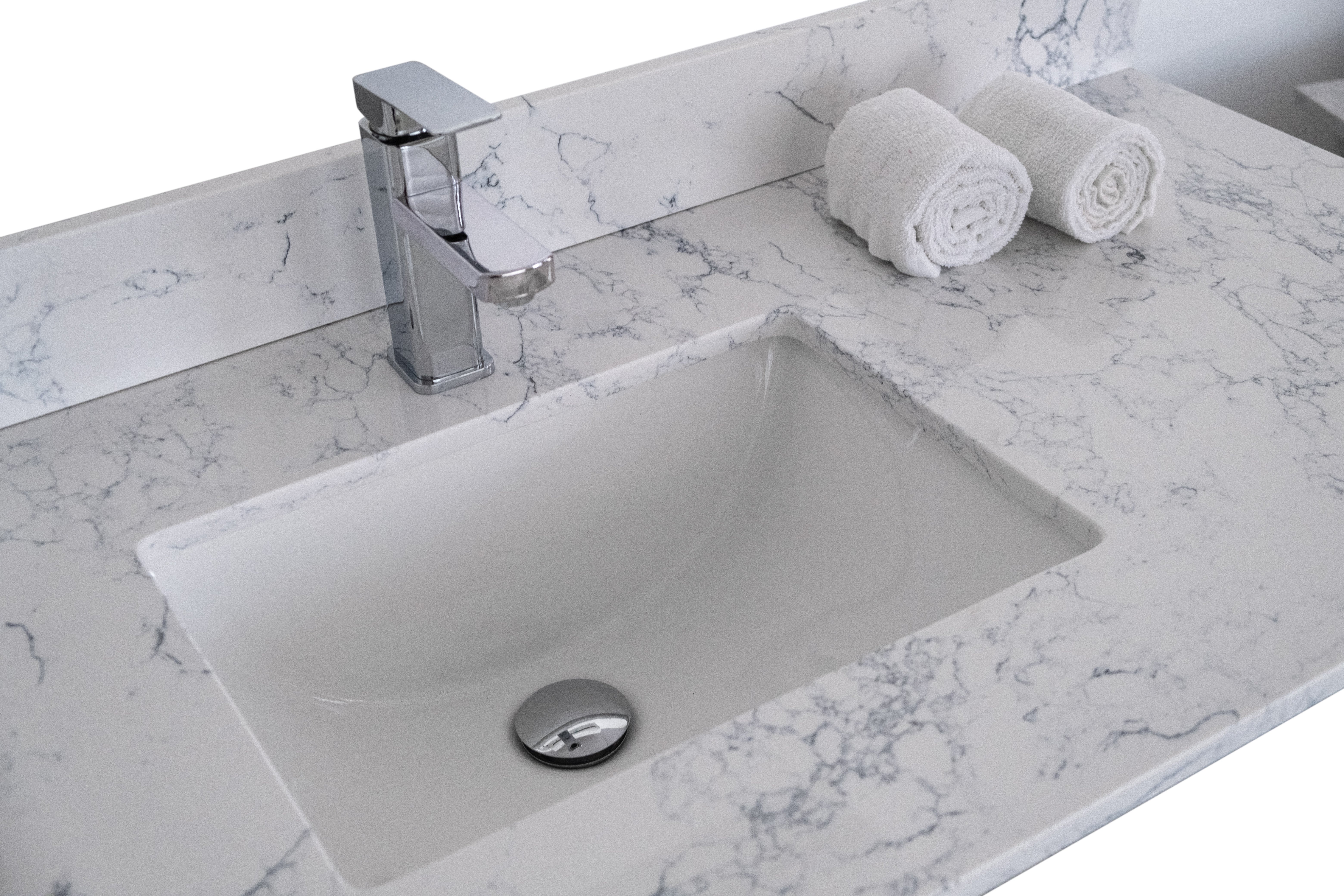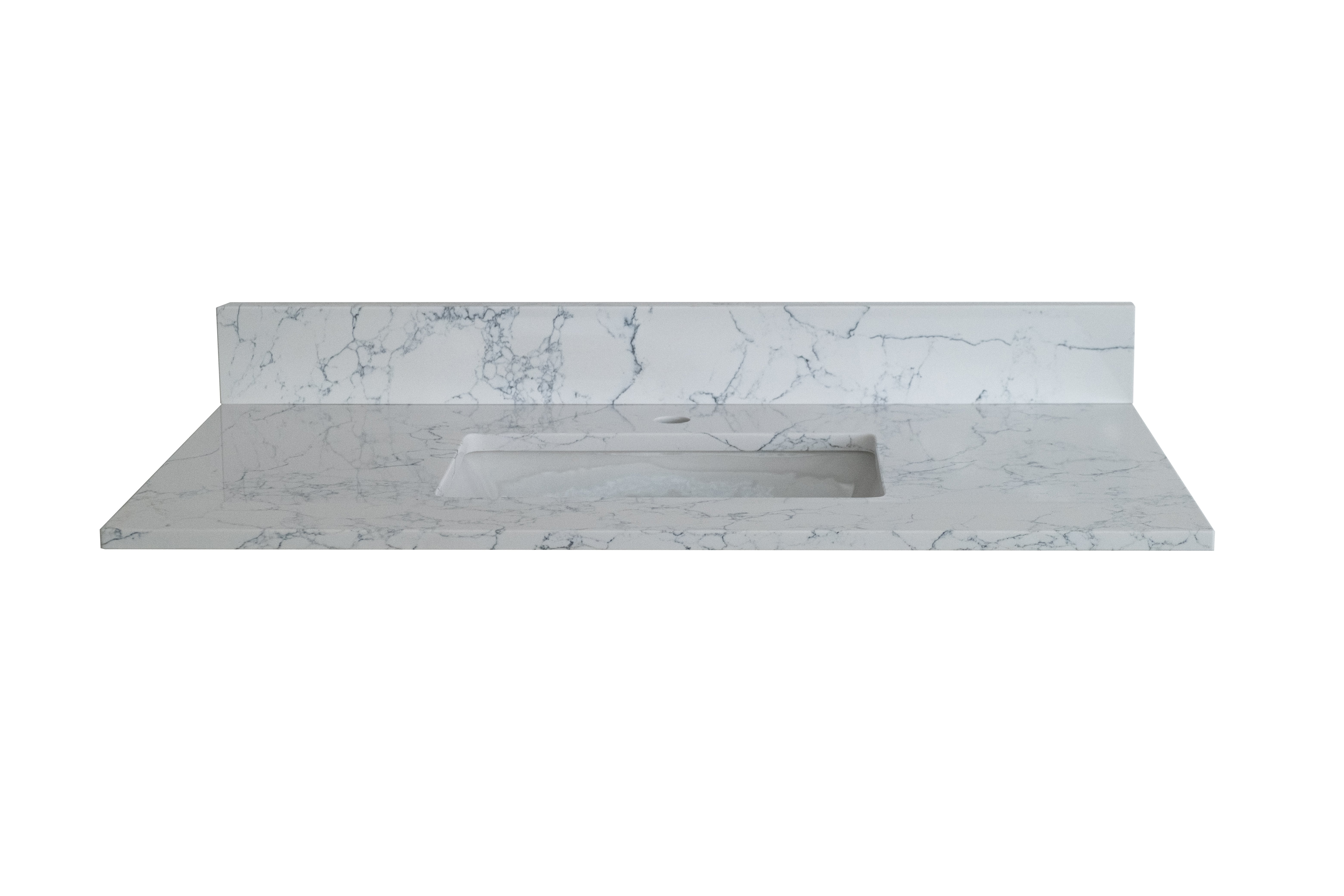 anity tops are made of beautiful Engineered stone. All exterior sides are polished for a luxurious look. Each model is complemented with a ceramic Rectangle undermount sink. The matching backsplash is included in each package.