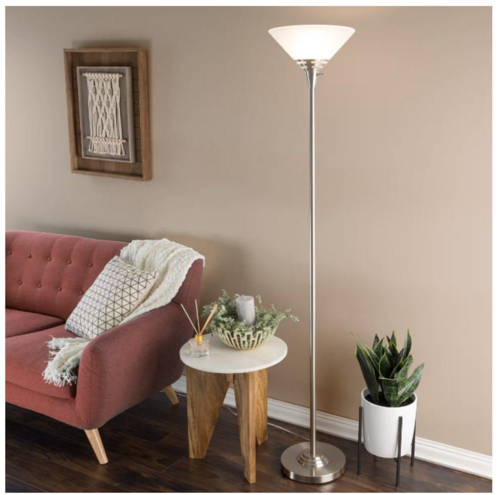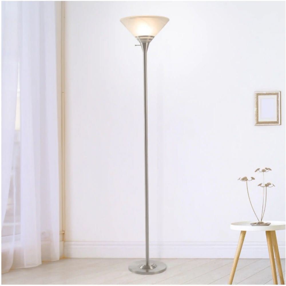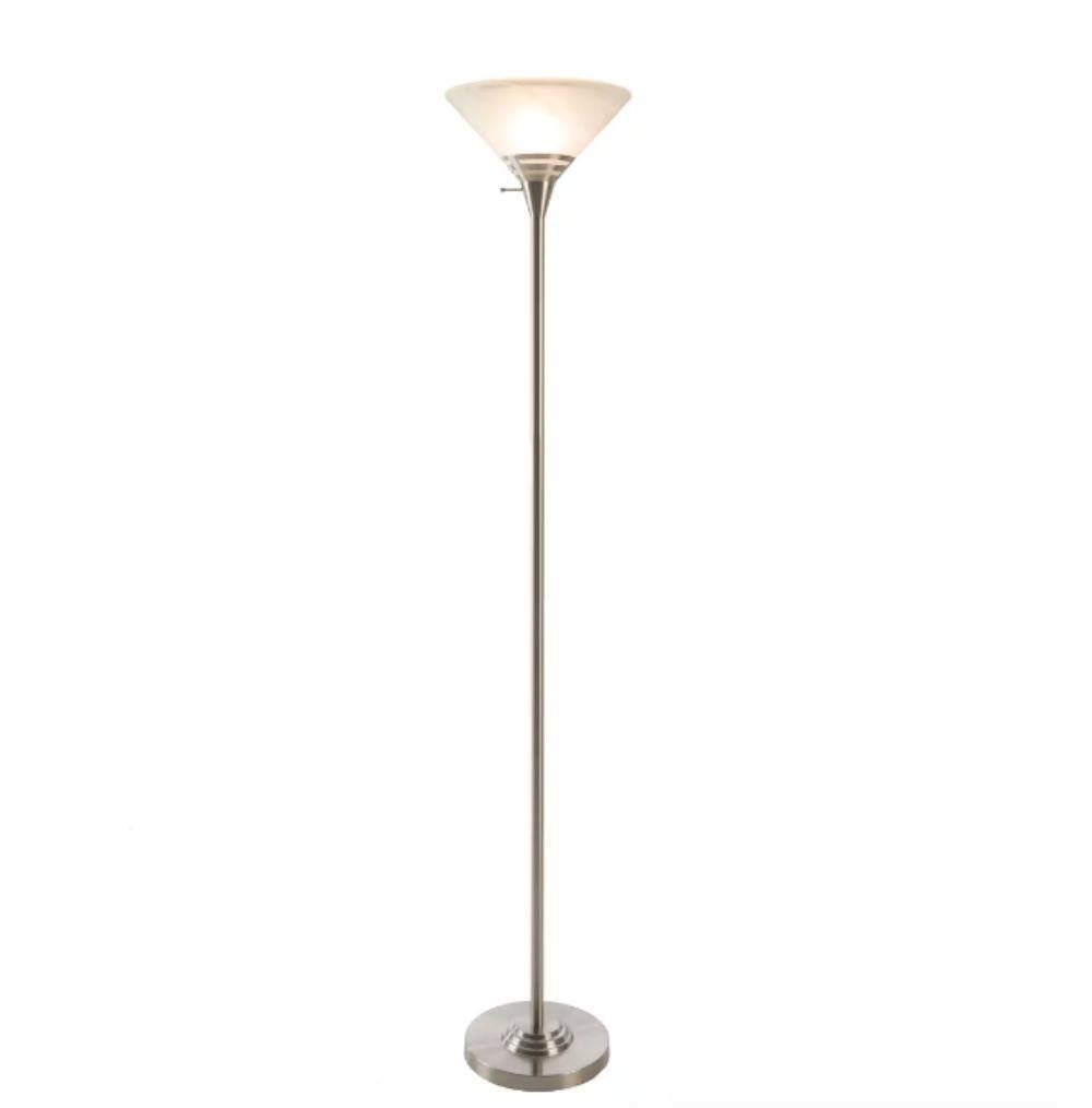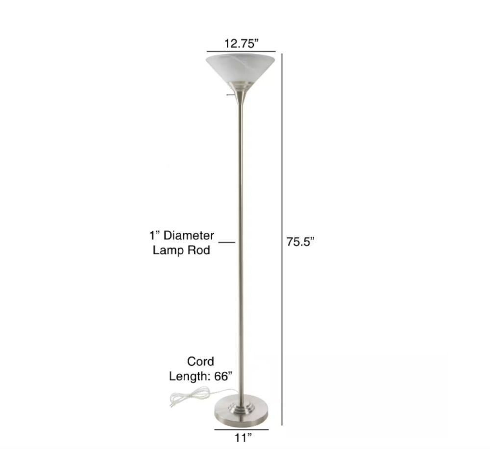 Product DetailsBrighten up your living space with this elegant floor lamp. Featuring a sturdy metal base and an upward facing marble glass shade, this lamp provides beautiful ambient lighting in your bedroom, living room or home office. The light features energy efficient replaceable LED bulbs and is also compatible with 3-way 150W Type A bulbs CFL or LED equivalent bulbs (not included) if you want to use the swivel function. The stylish design with brushed silver finish is attractive and will complement any home decor.Ambient Lighting - Beautifully enhances and illuminates any room in your home. The upward facing frosted glass shade will provide soft ambient light to your bedroom, living room or home office. It provides great light for reading or relaxing!LED Bulb Included - The light comes with a highly efficient, energy saving LED bulb for your convenience. This floor lamp also has a swivel function that can be used by switching to a 3-way 150W Type A bulb CFL or LED equivalent bulb (not included).STURDY AND DURABLE - The metal body and weighted base make it a strong, durable and long-lasting home lighting choice. The light is easy to assemble and the light switch is conveniently located under the shade.FITS ANY DECOR - This charming flashlight has a slim profile, takes up little space and features a brushed silver finish that will add a fresh touch to your home or office decor.Product Details: Material: Marble Glass Shade; Brushed Silver Metal Body/Base. Dimensions: (Height) 75.5" x (Shade Diameter) 12.75", (Base Diameter) 11".Wire 66 in. Includes LED bulb and instructions.