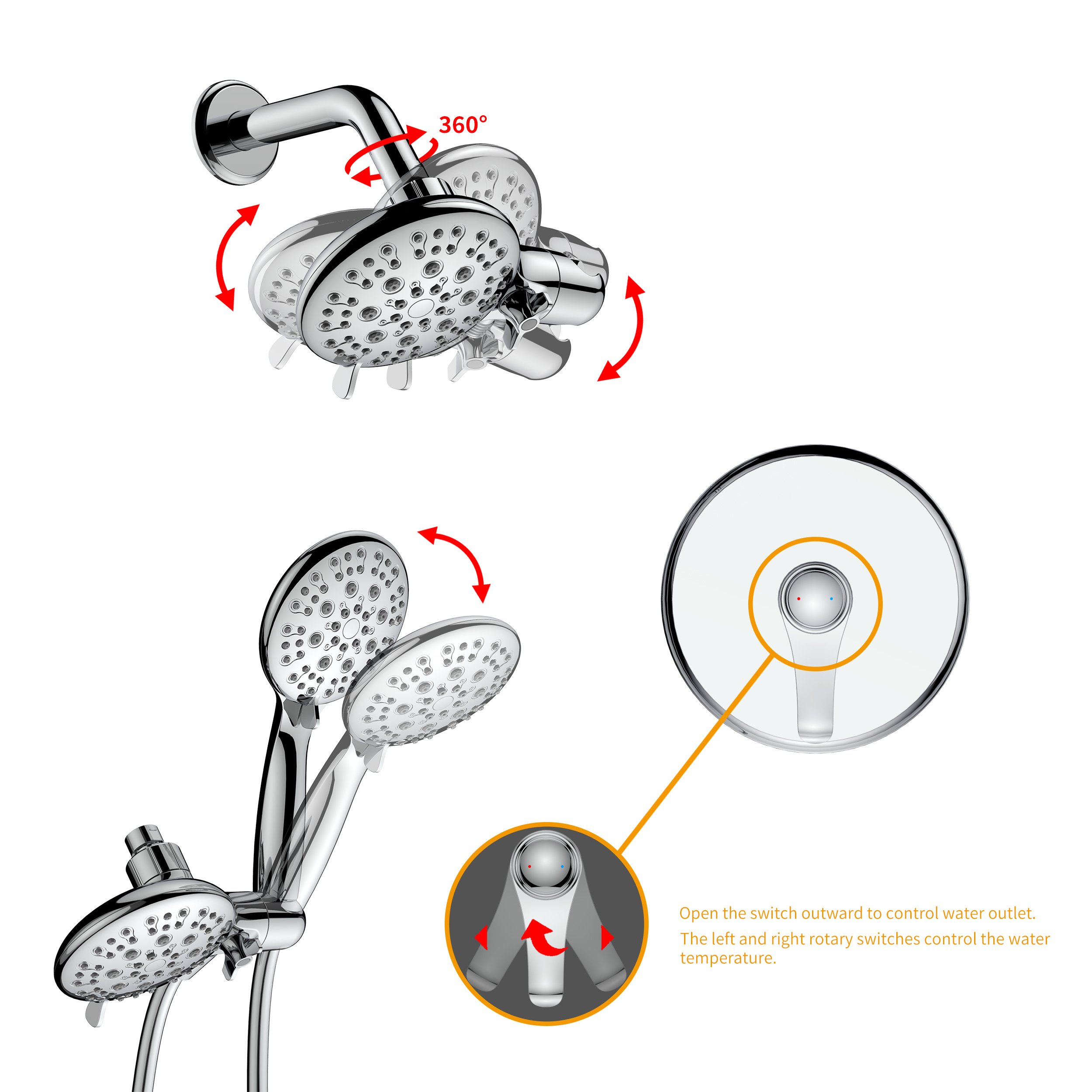 ·The rain shower head can be adjusted to any angle according to your needs.·Made of soft silicone material, you can clean the blockage and scale of the nozzle just by touching it with your hands.The pressure balance valve chamber monitors the water pressure balance to avoid scalding, our mixing valve has an adjustable cold and hot water flow device and a check valve, which helps us to adjust the proper cold and hot water flow when necessary.This shower system can switch the water outlet mode through the knob (shower/hand shower, currently does not support the simultaneous water outlet of the shower and hand shower)