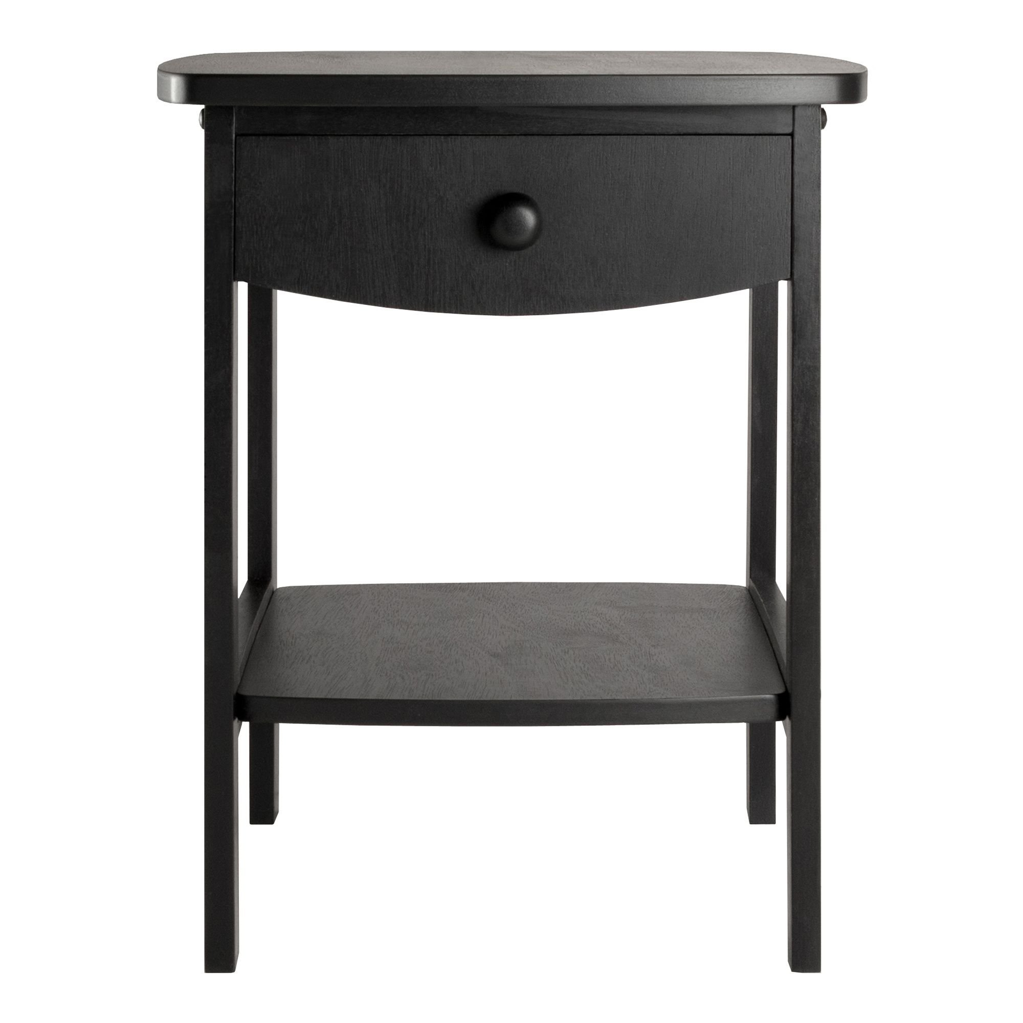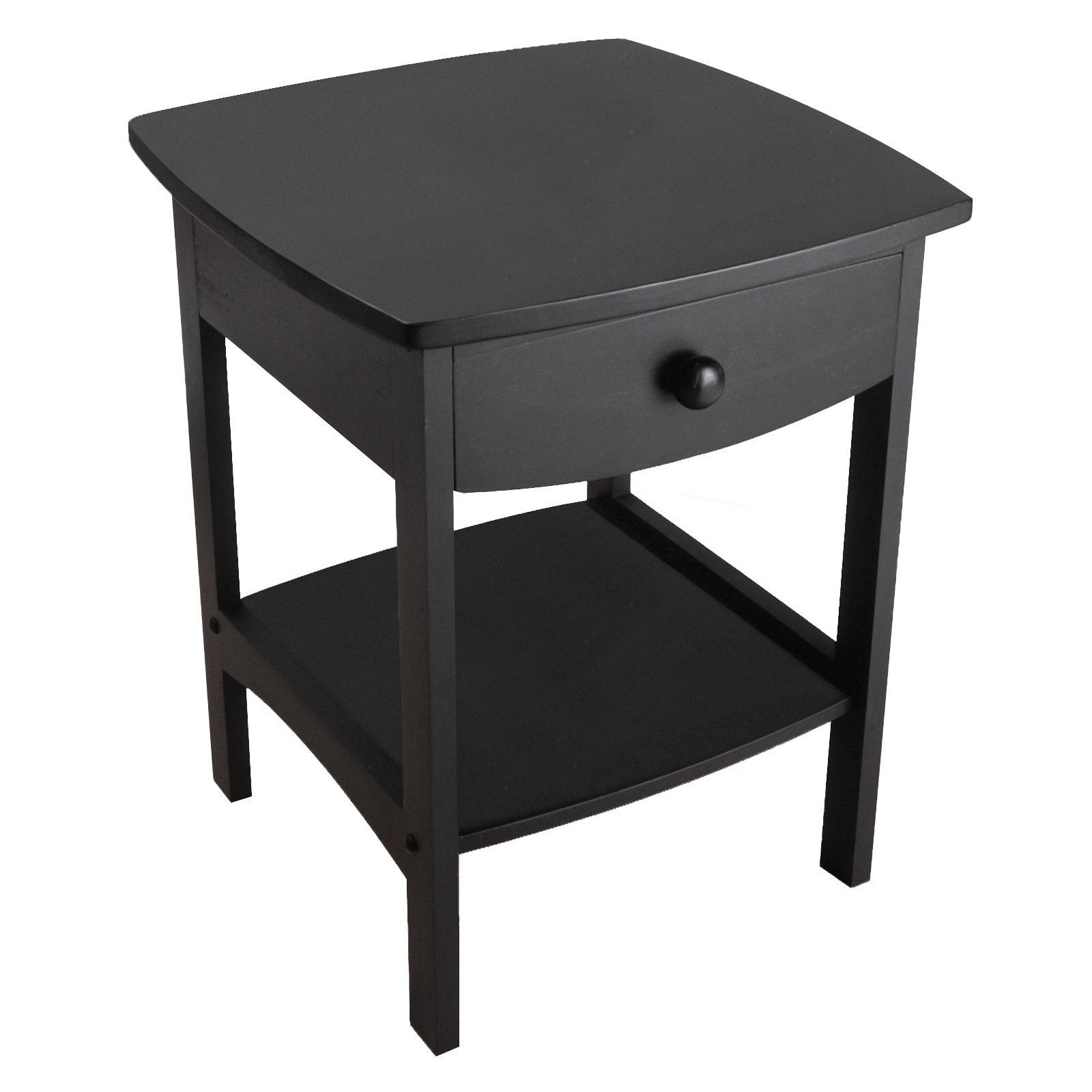 Elegantly simple; the Claire Accent Table has room for all the necessary nighttime accessories. Its curved; smooth design blends well with any style of bedroom decor. Assembled size is 18"W x 18"D x 22"H. Table comes with one drawer with inside dimension of 12"W x 13.75"D x 2.3"H and a shelf with surface size of 13.3"W x 14.8"D. Available in white; black; walnut and clear wood finish. Assembly required.Table stands at 18"W x 18"D x 22"H. Drawer has inside dimension of 12"W x 13.75"D x 2.3"H.Shelf surface is 13.3"W x 14.8"D with shelf clearance of 9.3" from bottom of drawer.Made with combination of solid and composite wood in black Finish. Assembly required.nullnullnull