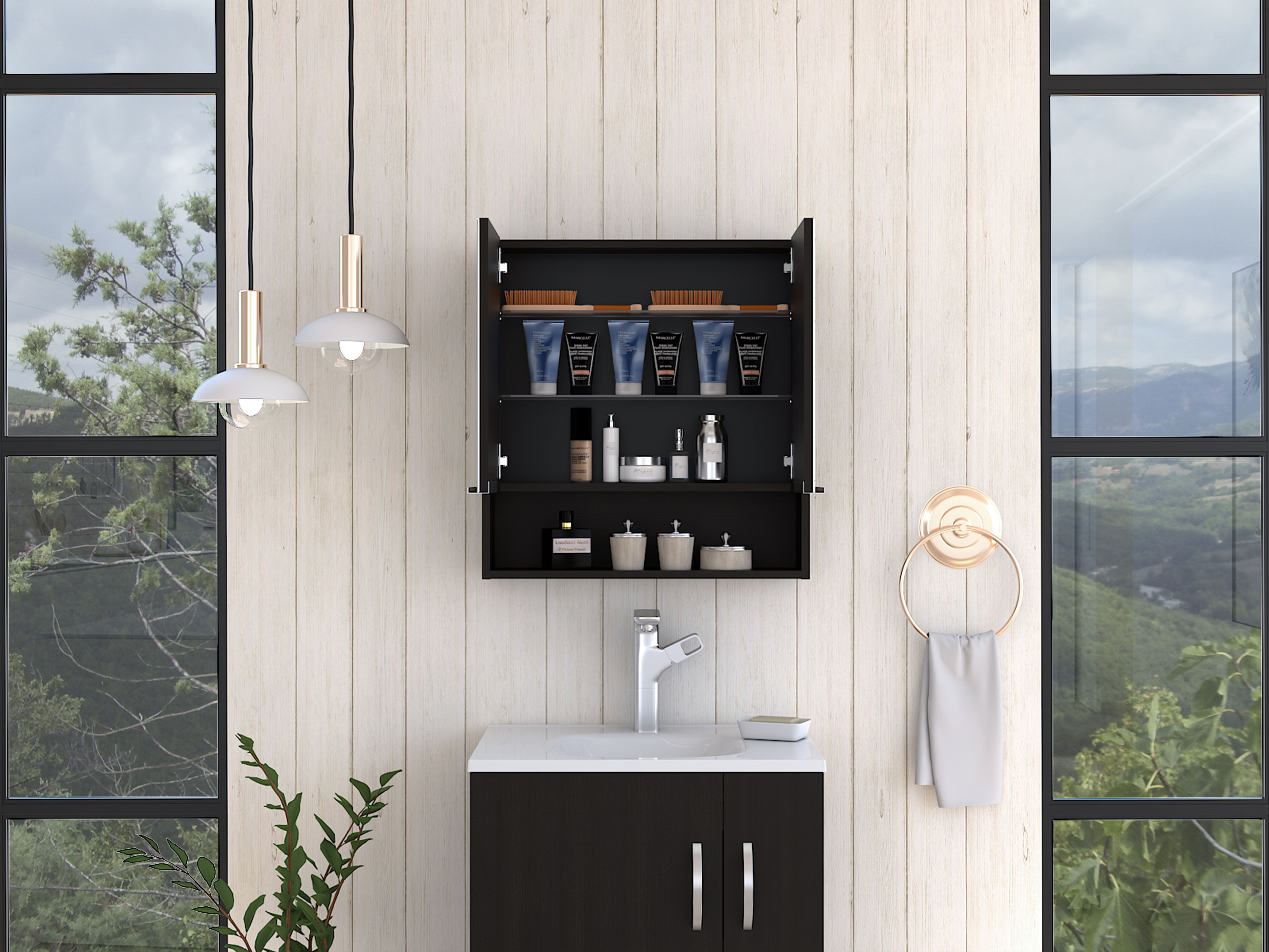 TUHOME brings you the Jaspe bathroom collection; Elegant; modern; very functional; and utterly simple mirror medicine cabinets.Designed with elegant and resistant black manufactured wood finish. Featuring two ample mirror doors with handles for a more practical use allows you to open and close the cabinet doors without leaving fingerprint marks on the mirrors and three interior shelves(4; 4''H X 5; 9''H X 5; 9''H X 10; 8''W). Finally; it features an open shelf (5; 7''H X 22; 4''W) at the bottom that will provide the option of displaying decorative items to give your bathroom that special touch or just the space to put your daily use items.Product dimensions (23; 6''W X 5; 5''D X 24; 6''H)