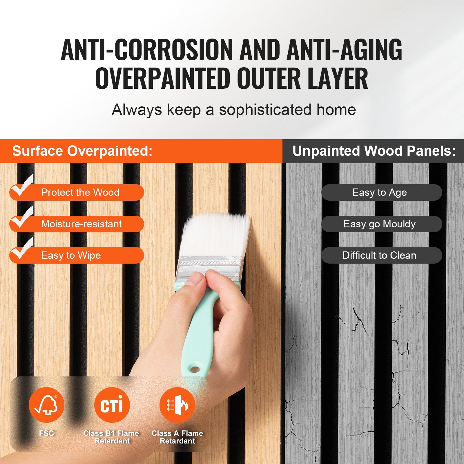 2.Anti-Aging Coating: The outer layer is treated with a corrosion-resistant, anti-aging finish that complies with FSC and B1 fire safety standards. This not only enhances the wood's durability but also provides excellent safety for your home, making daily cleaning a breeze.