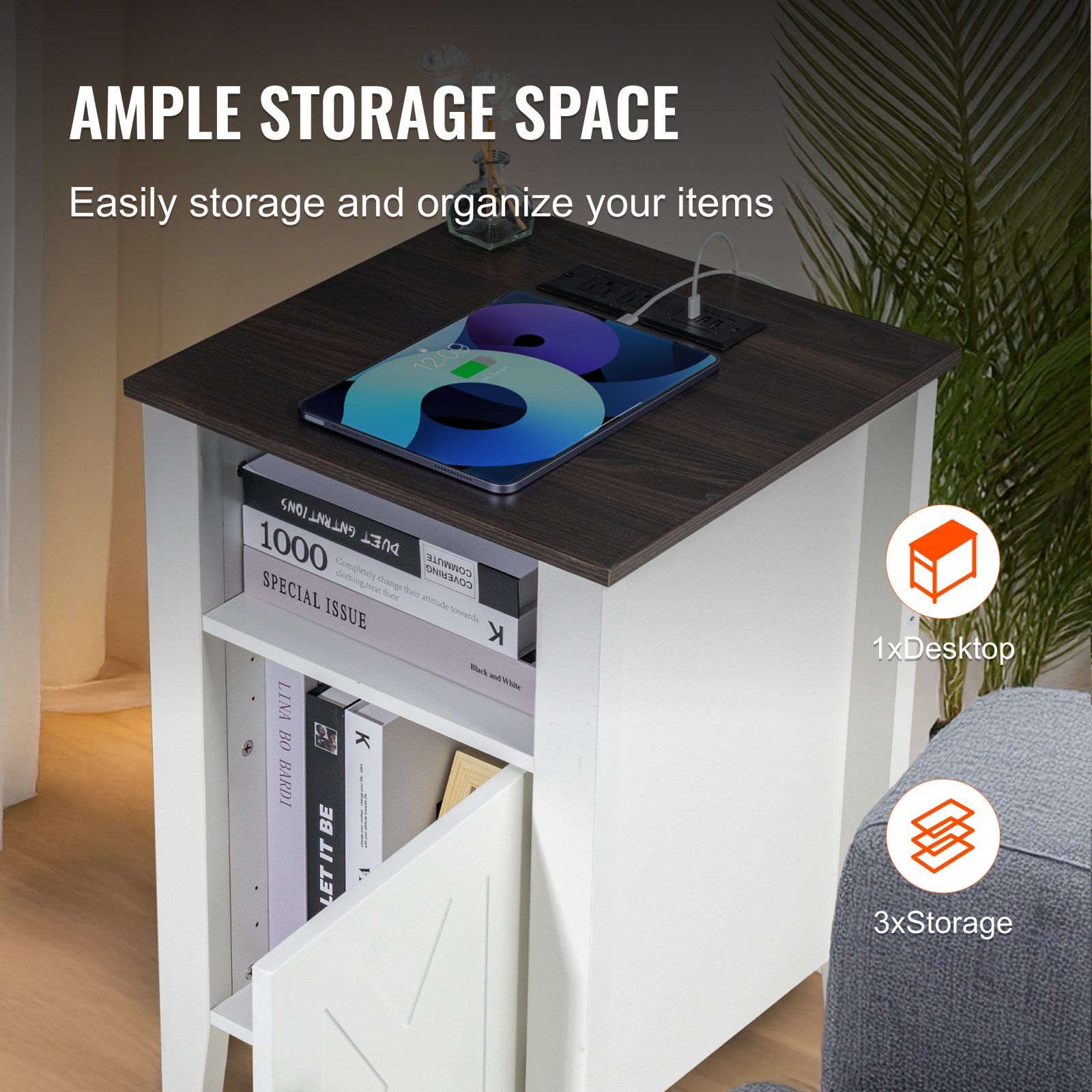 This farmhouse end table offers built-in charging with 2 AC outlets, 2 USB ports, and 1 Type-C port, providing convenience for all your electronic devices. It helps organize books, decorative items, and gadgets, keeping your space neat and tidy.