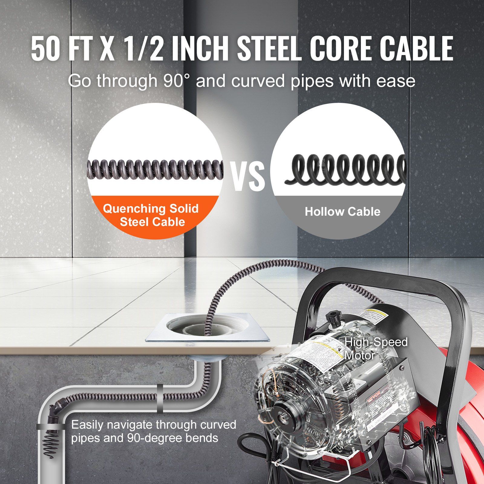 2.Premium Steel Core Cable: Our 50 FT x 1/2" sewer snake machine steel core cable is designed to resist breakage, twisting, and corrosion, ensuring easy navigation through complex curved pipes from 2 to 4-inch, ensuring smooth and efficient cleaning process