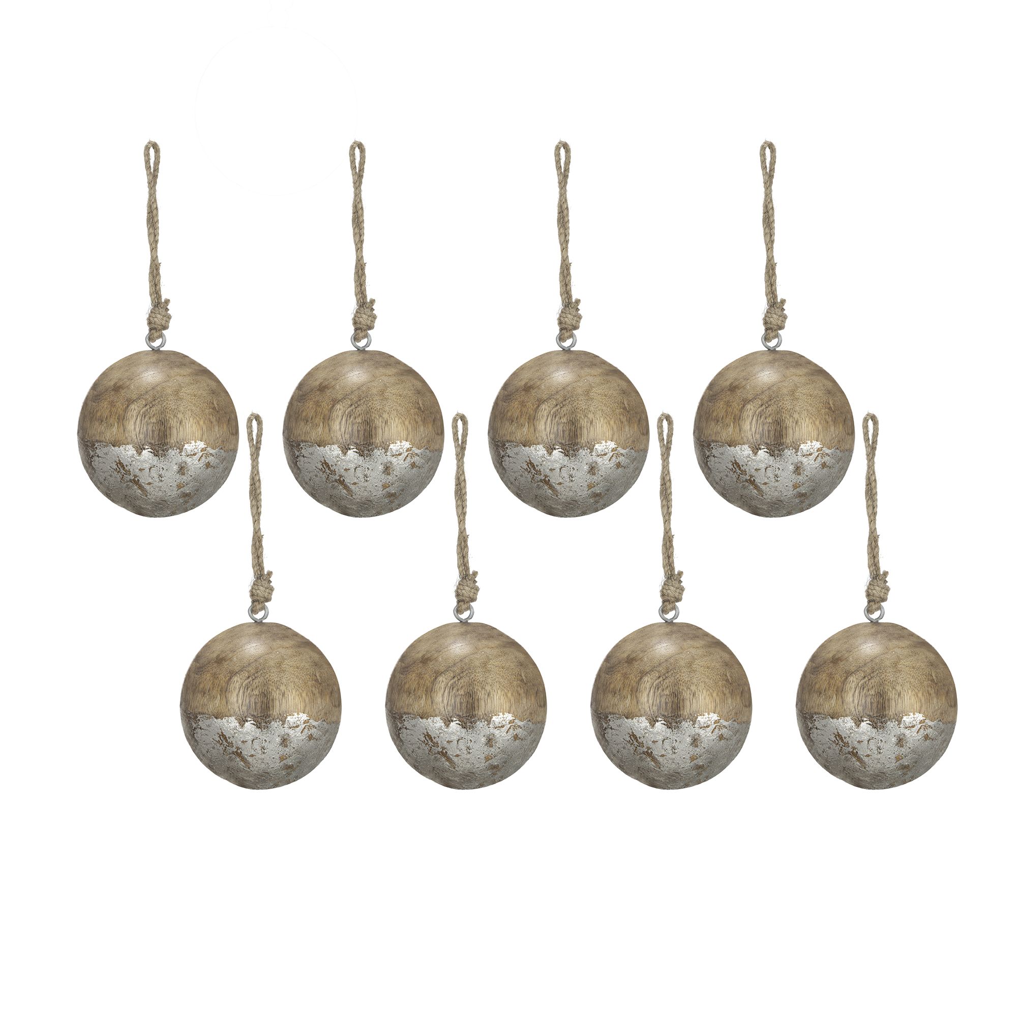 Set of 4Stunning 4″ Natural Wood And Antiqued Silver Ball Ornament With Jute Hanger.