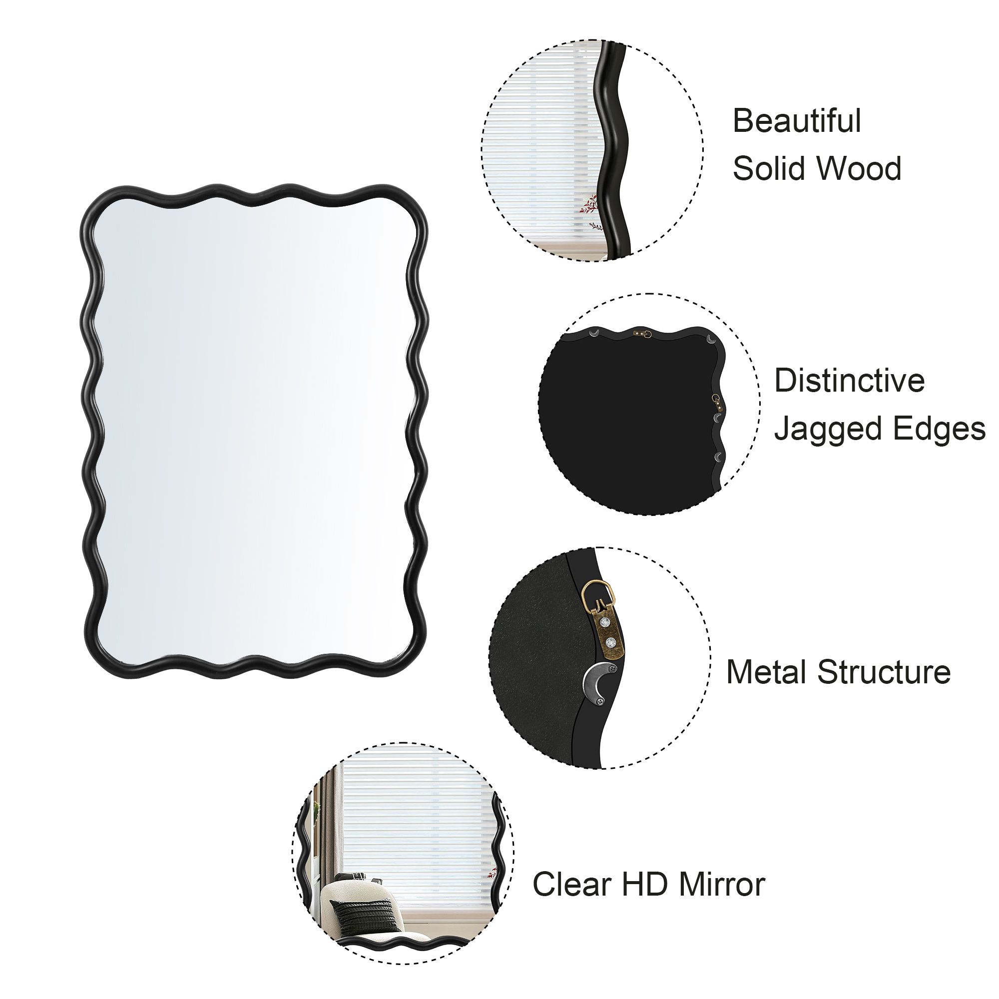 EXQUISITE WAVE WOOD MIRROR FRAME:The wall mirror is made of sturdy wood mirror frame, the frame has a smooth surface, no odour, safe and environmentally friendly. The wooden frame has a chic look and creates a farmhouse art deco design style.
