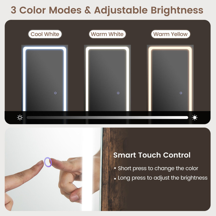 3.2 Adjustable LED Lighted Mirrors: The full-length mirror has 3 color modes (cool white, natural white, warm white), and the adjustment is simple through the touch switch: short press to change the color mode, long press to adjust the brightness. The inside 3-color makeup mirror (blue, white + blue, yellow) provides optimal lighting for your beauty routine.