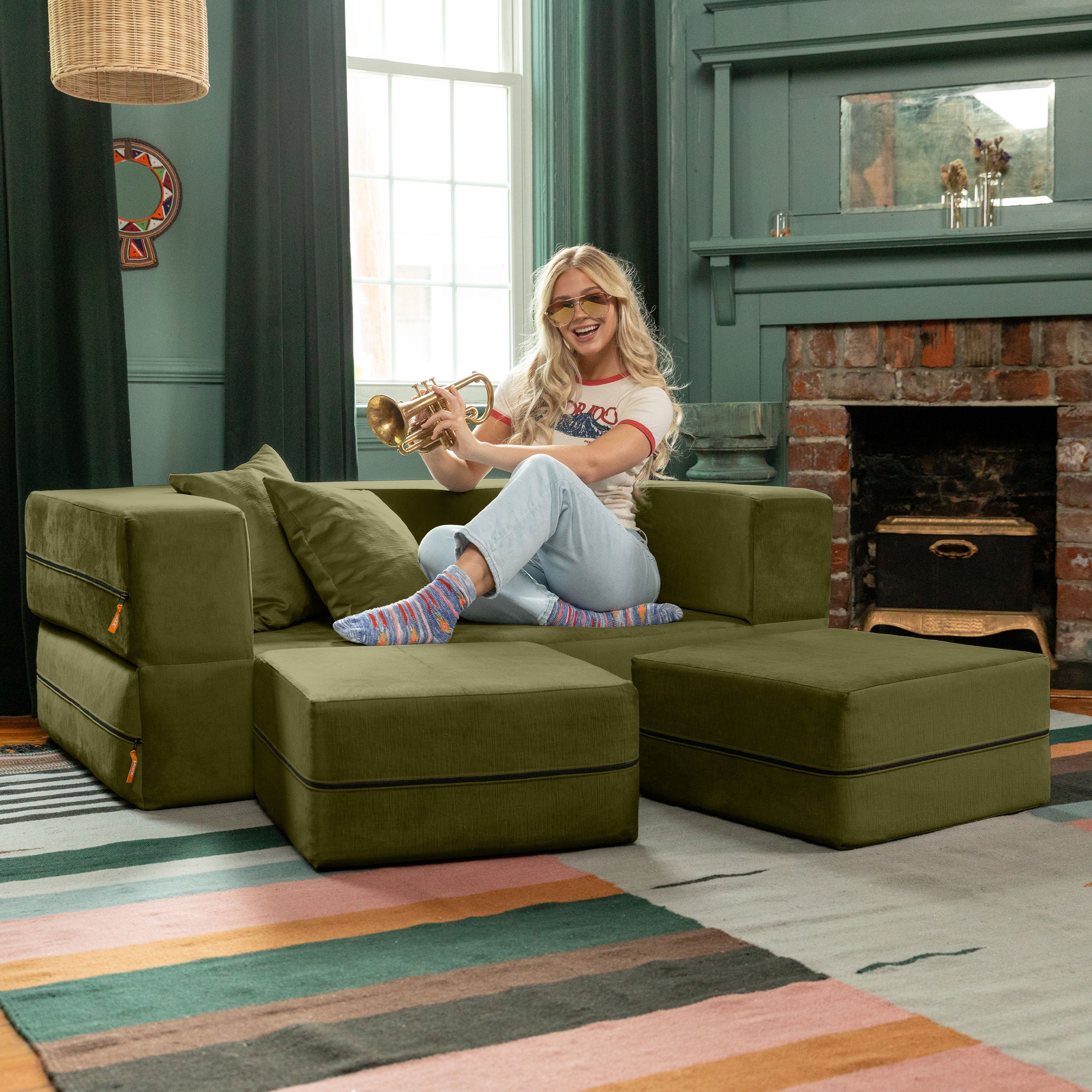 Jaxx Zipline Convertible Sleeper Loveseat & Ottomans, Textured Microvelvet - Moss