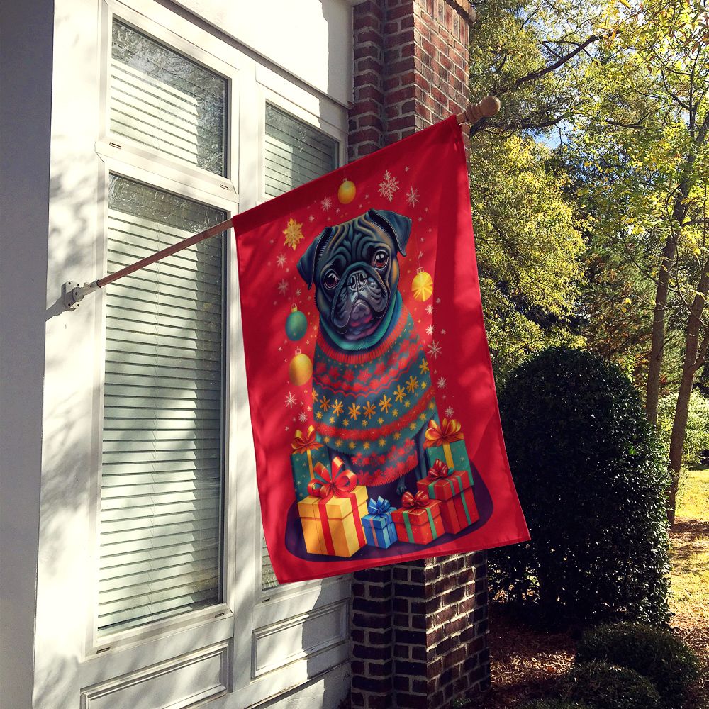Black Pug Holiday Christmas House Flag Large Porch Sleeve Pole Decorative Outside Yard Banner Artwork Wall Hanging, Polyester, House Size, Multicolor