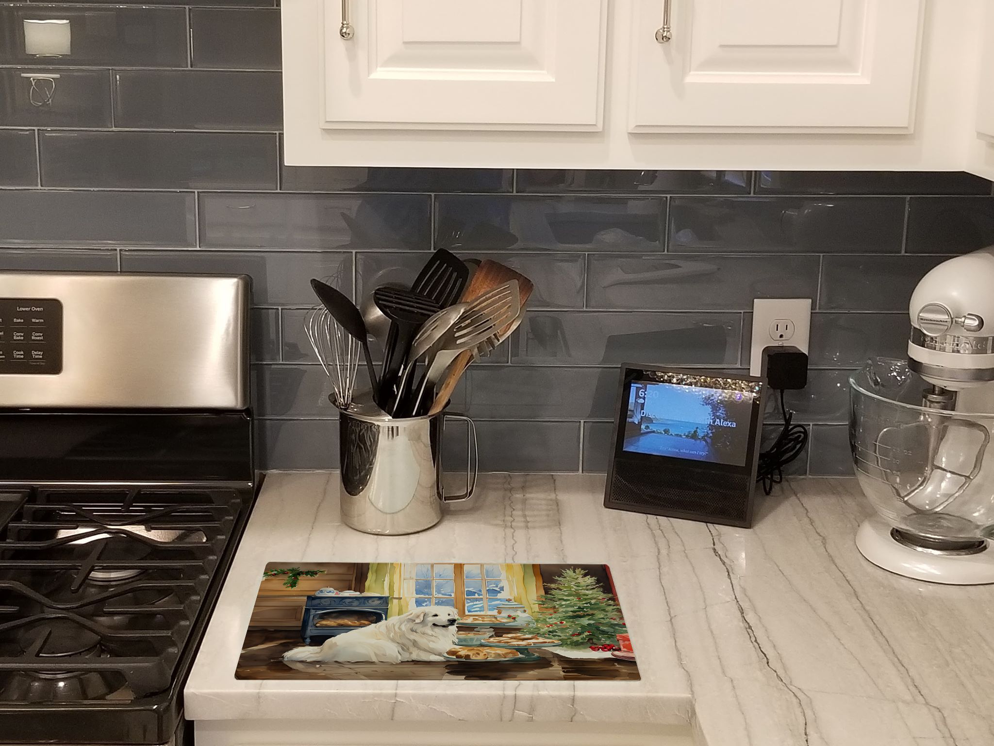 Glass Cutting Board featuring breed specific Great Pyrenees artwork. Celebrate Christmas with this Christmas Cutting Board. Introduce your kitchen to the vibrant, large Decorative Glass Cutting Board from Caroline's Treasures. Crafted from resilient tempered glass, this board is not only a utilitarian necessity but also a colorful art piece. With its generous dimensions of 15 inches in height and 12 inches in length, it offers ample space for all your cutting needs. Every piece showcases captivating artwork from distinguished artists, bringing an aesthetic edge to your kitchen. Beyond its attractive design, this cutting board ensures your countertop stays pristine and unscathed, owing to its heat-resistant properties. Engineered with user convenience in mind, it features non-skid feet for stability, and rounded corners for additional safety. Its robust construction renders it virtually unbreakable, guaranteeing longevity. The board comes with protective feet bumpers, maintaining its position during use. This product is recommended to be hand washed only. Proudly printed and assembled in the United States, this cutting board exemplifies superior craftsmanship. With Caroline's Treasures' Decorative Glass Cutting Board, you're investing in a blend of functionality and artistic flair.