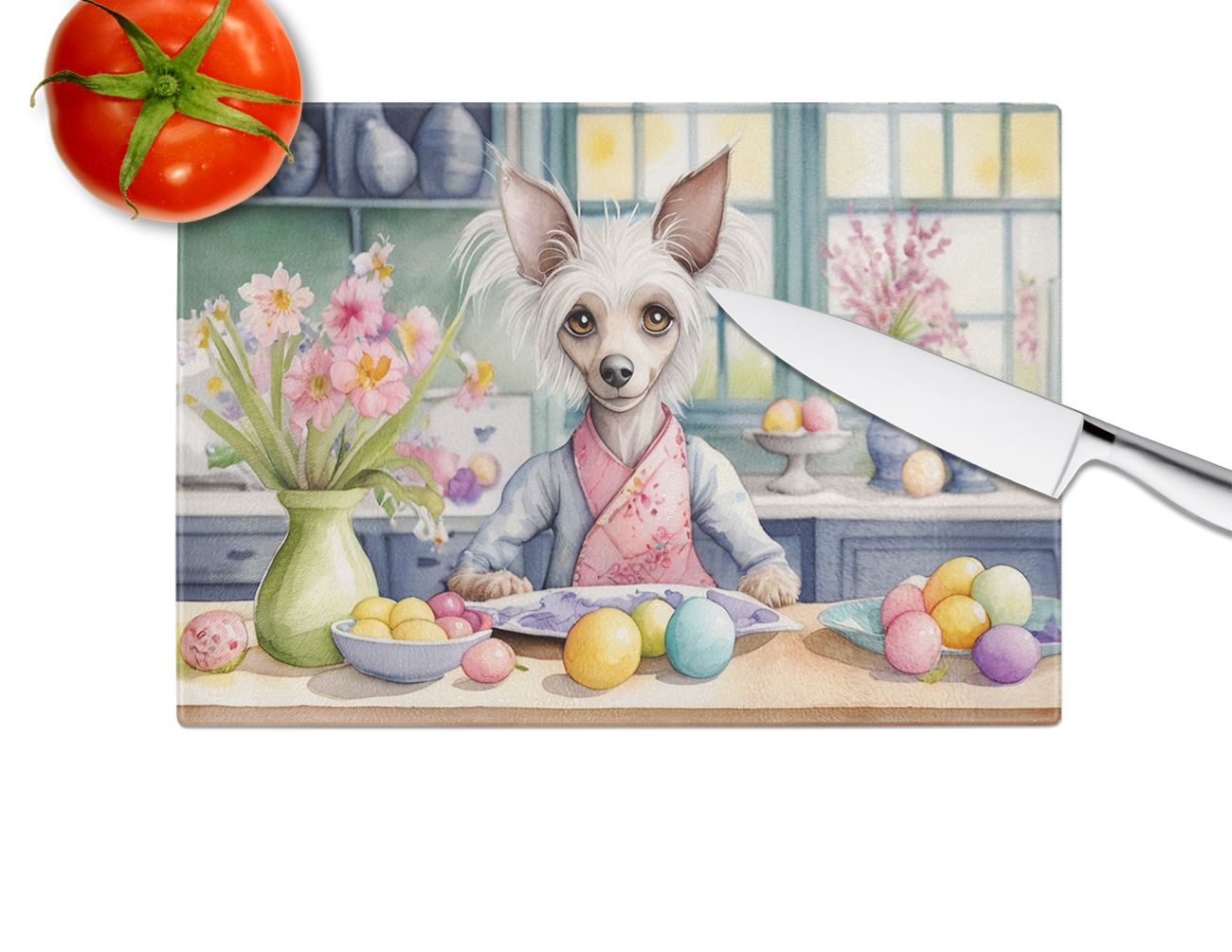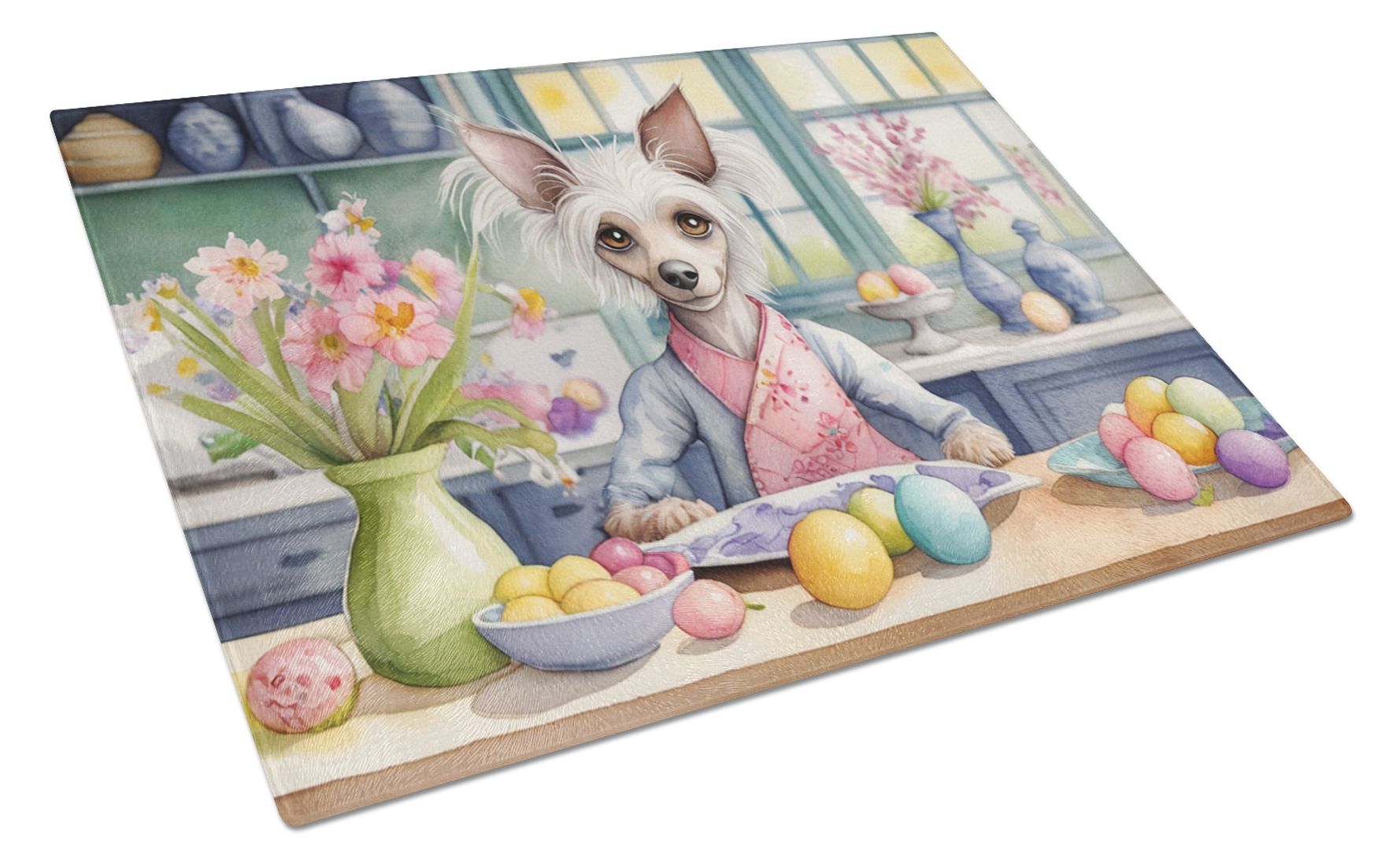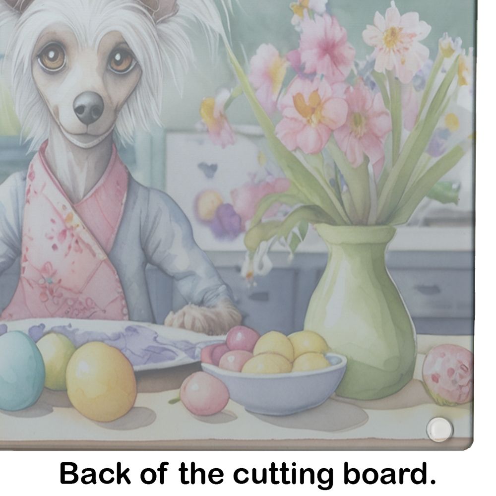 Glass Cutting Board featuring breed specific Chinese Crested artwork. Celebrate Easter with this Easter Cutting Board. Introduce your kitchen to the vibrant, large Decorative Glass Cutting Board from Caroline's Treasures. Crafted from resilient tempered glass, this board is not only a utilitarian necessity but also a colorful art piece. With its generous dimensions of 15 inches in height and 12 inches in length, it offers ample space for all your cutting needs. Every piece showcases captivating artwork from distinguished artists, bringing an aesthetic edge to your kitchen. Beyond its attractive design, this cutting board ensures your countertop stays pristine and unscathed, owing to its heat-resistant properties. Engineered with user convenience in mind, it features non-skid feet for stability, and rounded corners for additional safety. Its robust construction renders it virtually unbreakable, guaranteeing longevity. The board comes with protective feet bumpers, maintaining its position during use. This product is recommended to be hand washed only. Proudly printed and assembled in the United States, this cutting board exemplifies superior craftsmanship. With Caroline's Treasures' Decorative Glass Cutting Board, you're investing in a blend of functionality and artistic flair.