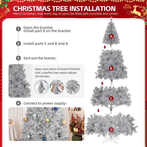 2. Eye Catching Color: The tree's vibrant silver color adds a unique and modern twist to traditional holiday decorations. This bold color choice not only creates a stunning visual contrast but also enhances the festive atmosphere, making your ornaments and lights pop against the pristine silver background.