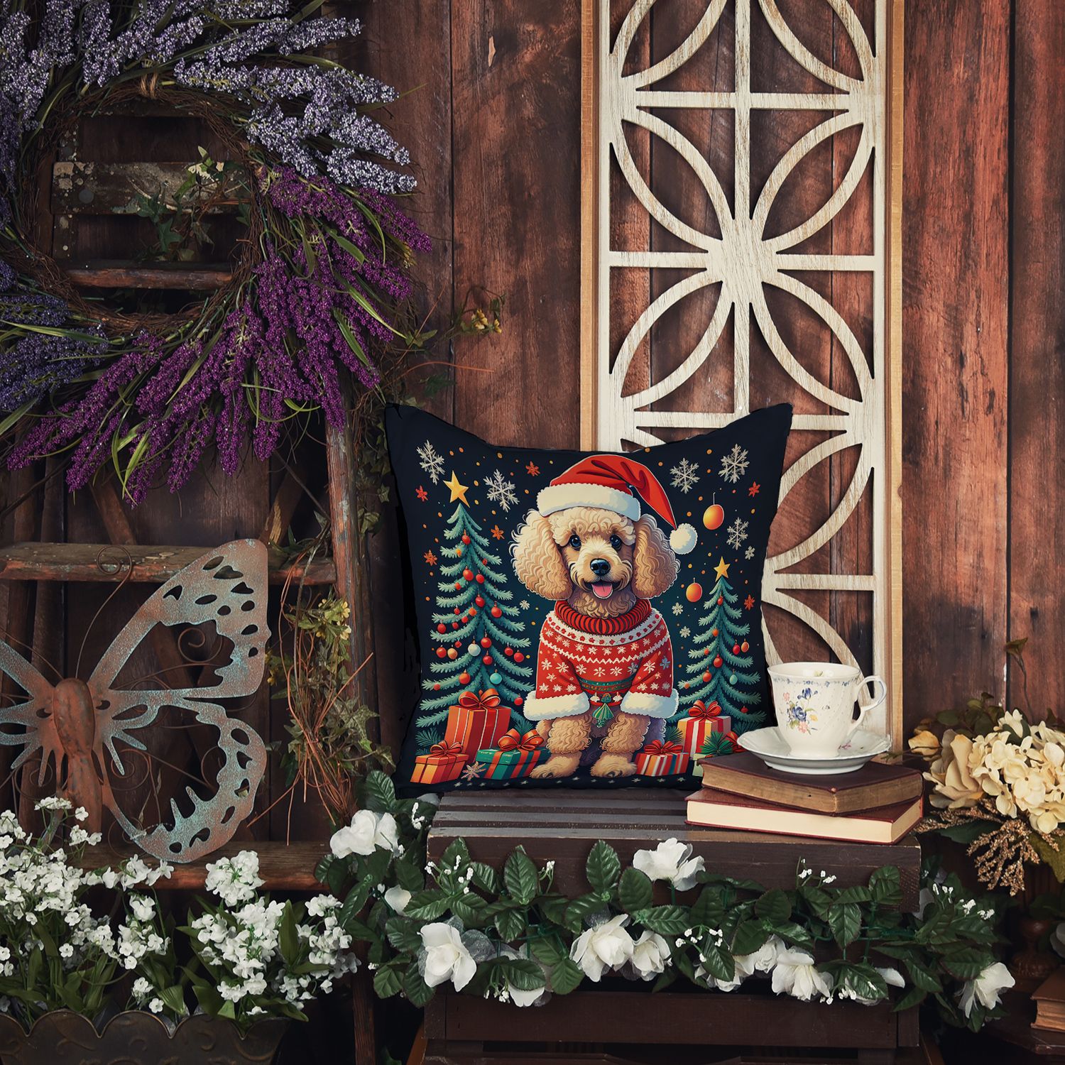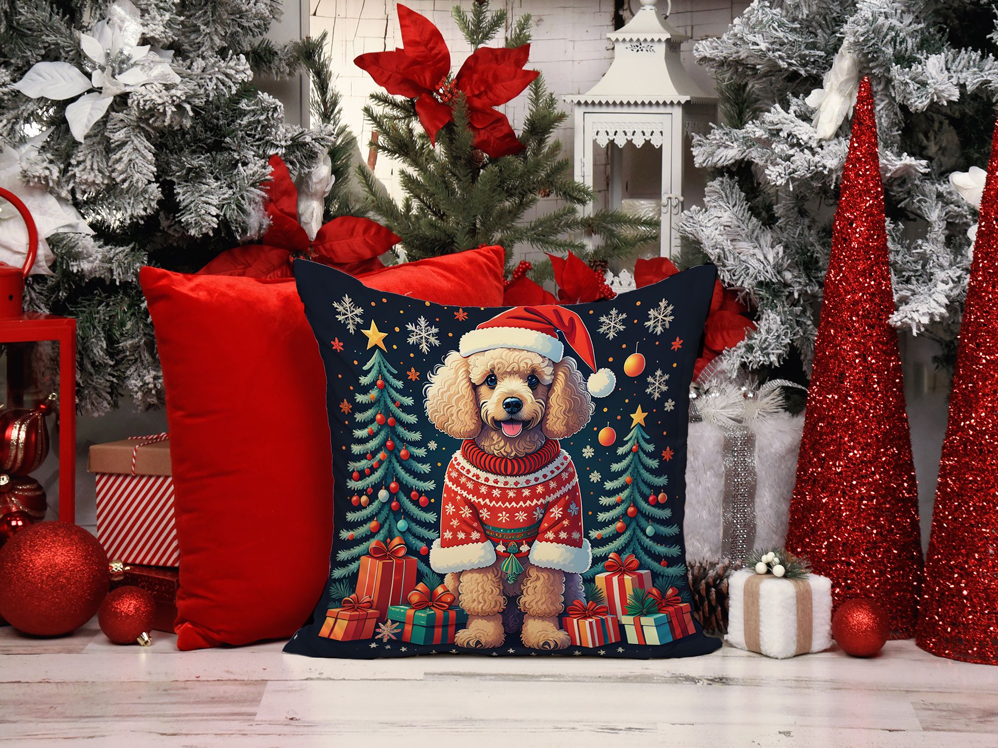 Throw Pillow featuring breed specific Poodle artwork. Celebrate Christmas with this Christmas Pillow. Add a touch of vibrancy and comfort to your outdoor seating with Caroline's Treasures Fabric Decorative Pillow. Measuring approximately 14 inches by 14 inches, this outdoor pillow is crafted to elevate the appeal of your patio furniture, infusing it with vivid color and artistic flair. The pillow includes a 100% Polyester Fabric sham filled with a quality pillow form to provide superior comfort. Innovatively made from our brand new material, specifically woven for its water resistance, this pillow is designed for durability. The soft canvas fabric offers versatility in use, fit for your indoor couch or your outdoor patio, porch, or veranda. The fabric is dyed with colorfast dyes built for resilience against weather conditions, ensuring the pillow retains its beauty over time. Constructed by sewing three fabric pieces to create a sham, the polyester insert is then nestled inside to form the pillow, resulting in an overstuffed pillow that maintains its shape. Both the sham and the pillow insert are proudly made in the United States. As the pillows are handcrafted, there may be minor variations in size, further enhancing their unique charm. Experience comfort in style with Caroline's Treasures Fabric Decorative Pillow.