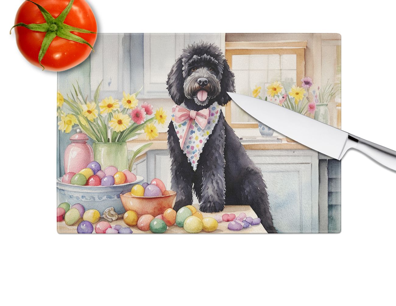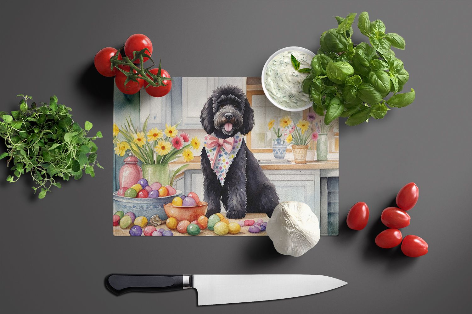Glass Cutting Board featuring breed specific Portuguese Water Dog artwork. Celebrate Easter with this Easter Cutting Board. Introduce your kitchen to the vibrant, large Decorative Glass Cutting Board from Caroline's Treasures. Crafted from resilient tempered glass, this board is not only a utilitarian necessity but also a colorful art piece. With its generous dimensions of 15 inches in height and 12 inches in length, it offers ample space for all your cutting needs. Every piece showcases captivating artwork from distinguished artists, bringing an aesthetic edge to your kitchen. Beyond its attractive design, this cutting board ensures your countertop stays pristine and unscathed, owing to its heat-resistant properties. Engineered with user convenience in mind, it features non-skid feet for stability, and rounded corners for additional safety. Its robust construction renders it virtually unbreakable, guaranteeing longevity. The board comes with protective feet bumpers, maintaining its position during use. This product is recommended to be hand washed only. Proudly printed and assembled in the United States, this cutting board exemplifies superior craftsmanship. With Caroline's Treasures' Decorative Glass Cutting Board, you're investing in a blend of functionality and artistic flair.
