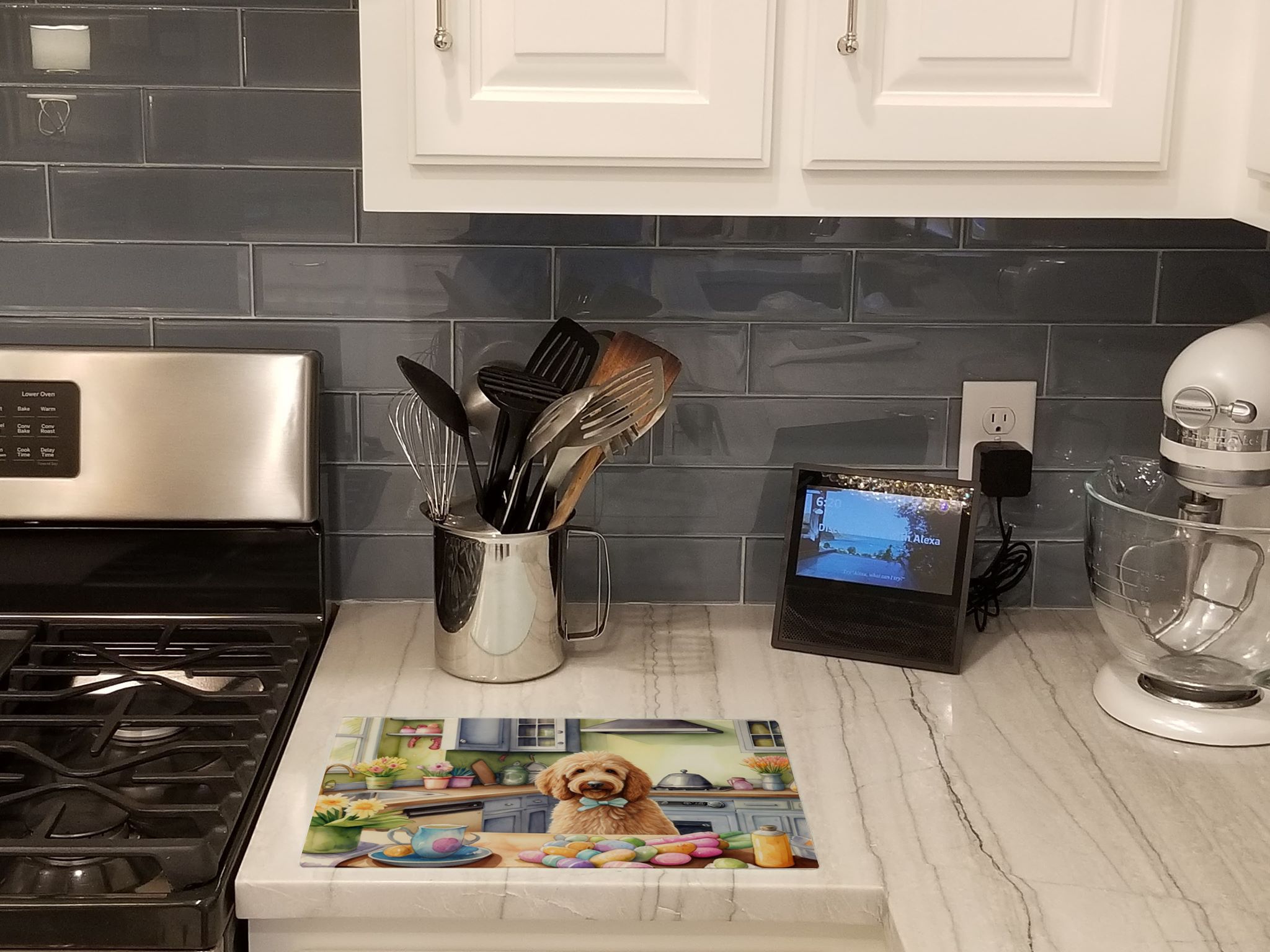 Glass Cutting Board featuring breed specific Goldendoodle artwork. Celebrate Easter with this Easter Cutting Board. Introduce your kitchen to the vibrant, large Decorative Glass Cutting Board from Caroline's Treasures. Crafted from resilient tempered glass, this board is not only a utilitarian necessity but also a colorful art piece. With its generous dimensions of 15 inches in height and 12 inches in length, it offers ample space for all your cutting needs. Every piece showcases captivating artwork from distinguished artists, bringing an aesthetic edge to your kitchen. Beyond its attractive design, this cutting board ensures your countertop stays pristine and unscathed, owing to its heat-resistant properties. Engineered with user convenience in mind, it features non-skid feet for stability, and rounded corners for additional safety. Its robust construction renders it virtually unbreakable, guaranteeing longevity. The board comes with protective feet bumpers, maintaining its position during use. This product is recommended to be hand washed only. Proudly printed and assembled in the United States, this cutting board exemplifies superior craftsmanship. With Caroline's Treasures' Decorative Glass Cutting Board, you're investing in a blend of functionality and artistic flair.
