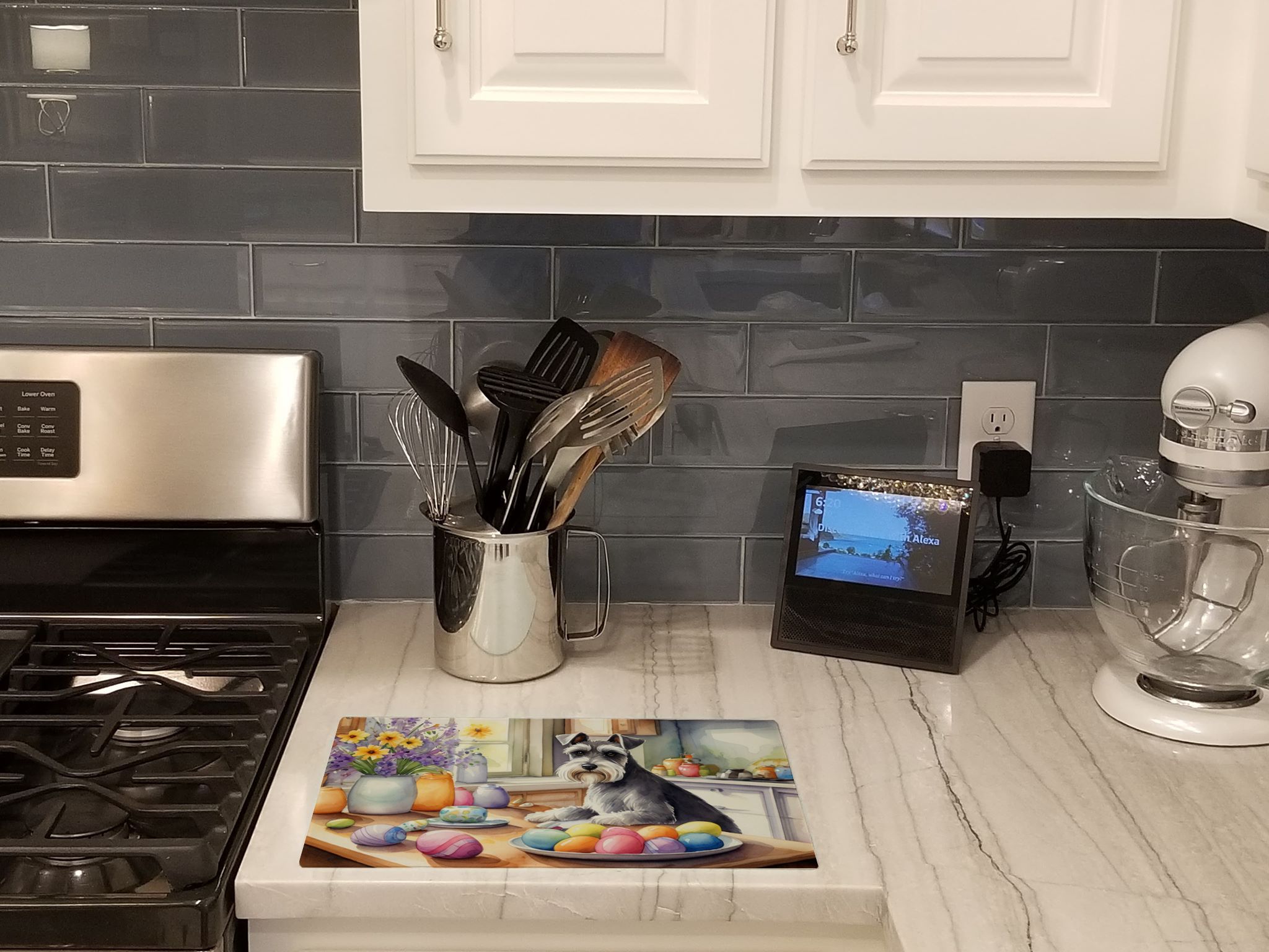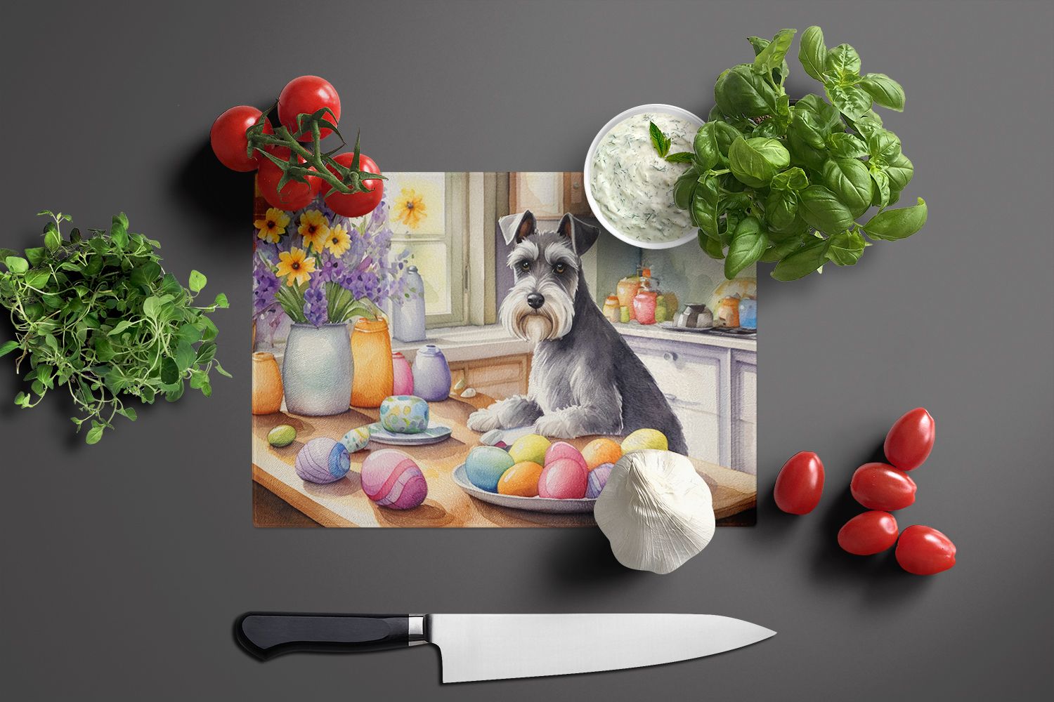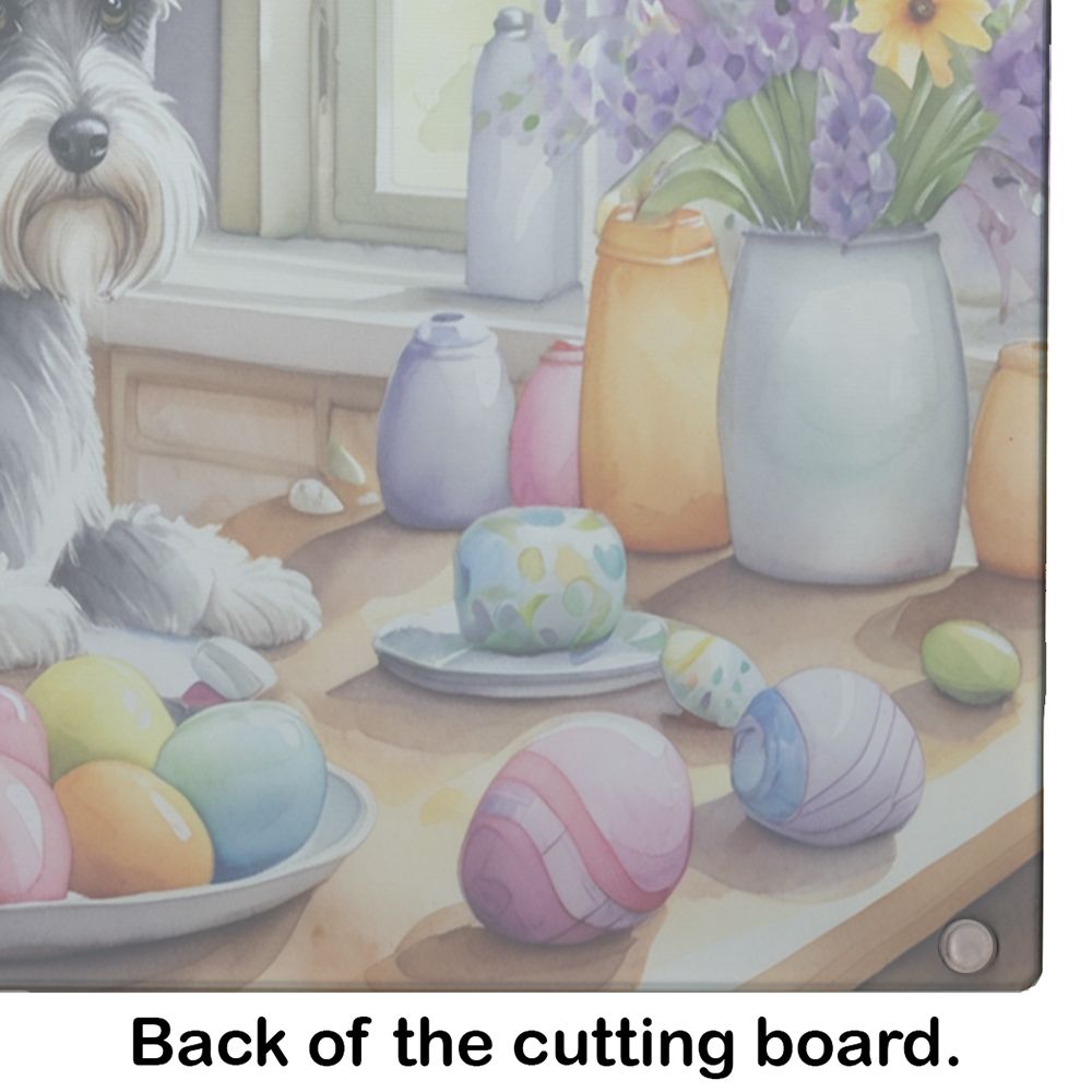 Glass Cutting Board featuring breed specific Schnauzer artwork. Celebrate Easter with this Easter Cutting Board. Introduce your kitchen to the vibrant, large Decorative Glass Cutting Board from Caroline's Treasures. Crafted from resilient tempered glass, this board is not only a utilitarian necessity but also a colorful art piece. With its generous dimensions of 15 inches in height and 12 inches in length, it offers ample space for all your cutting needs. Every piece showcases captivating artwork from distinguished artists, bringing an aesthetic edge to your kitchen. Beyond its attractive design, this cutting board ensures your countertop stays pristine and unscathed, owing to its heat-resistant properties. Engineered with user convenience in mind, it features non-skid feet for stability, and rounded corners for additional safety. Its robust construction renders it virtually unbreakable, guaranteeing longevity. The board comes with protective feet bumpers, maintaining its position during use. This product is recommended to be hand washed only. Proudly printed and assembled in the United States, this cutting board exemplifies superior craftsmanship. With Caroline's Treasures' Decorative Glass Cutting Board, you're investing in a blend of functionality and artistic flair.