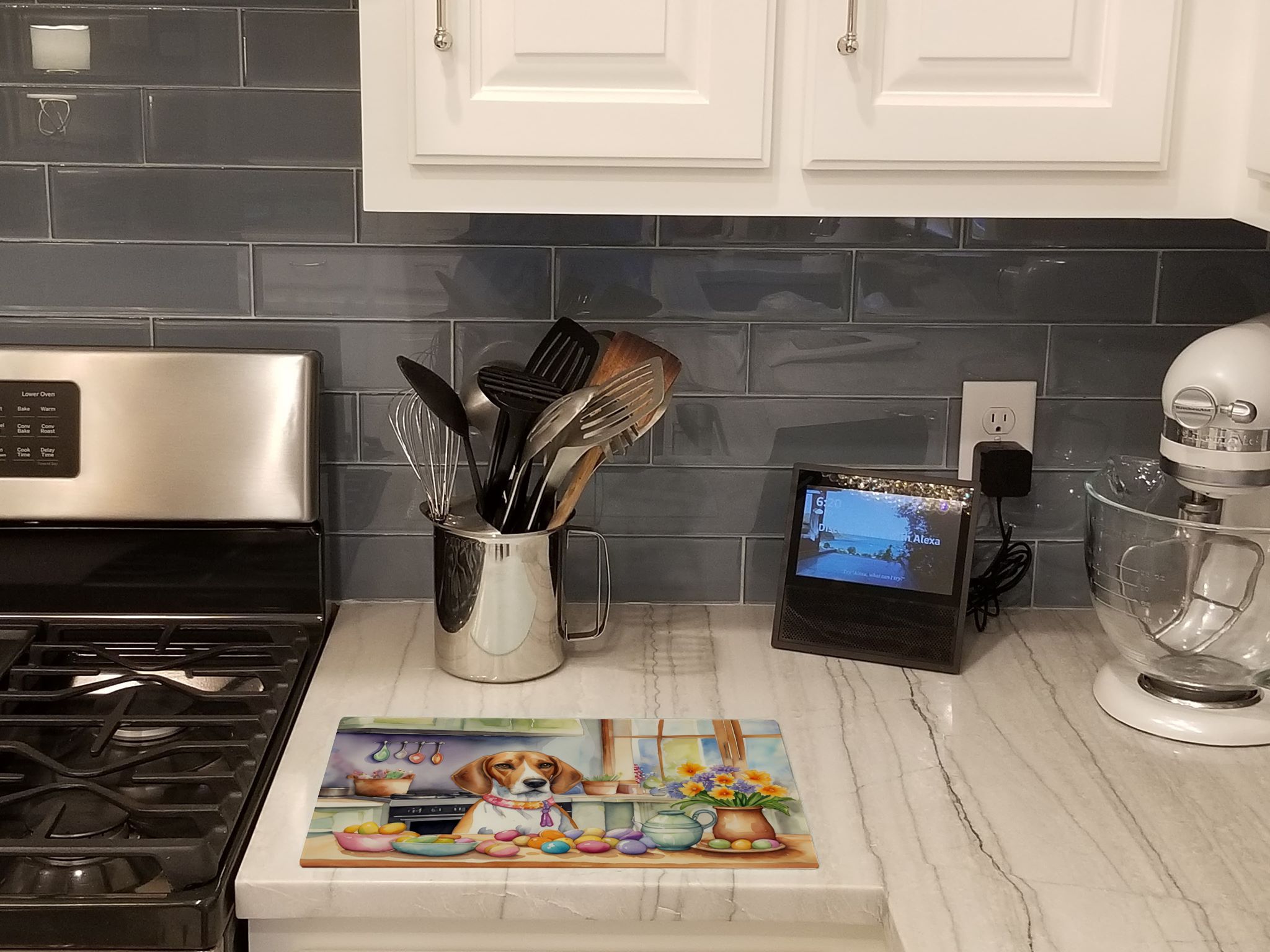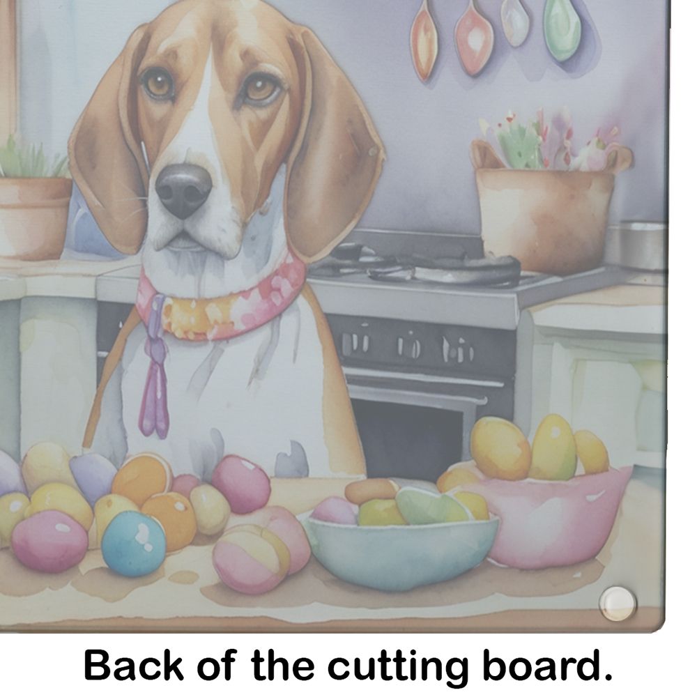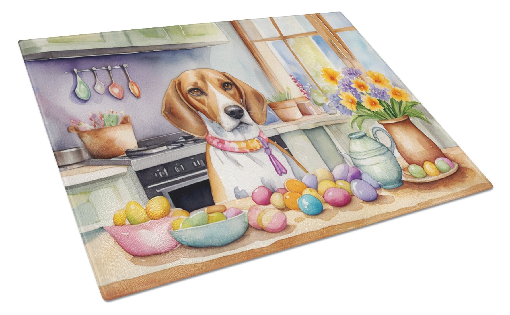 Glass Cutting Board featuring breed specific English Foxhound artwork. Celebrate Easter with this Easter Cutting Board. Introduce your kitchen to the vibrant, large Decorative Glass Cutting Board from Caroline's Treasures. Crafted from resilient tempered glass, this board is not only a utilitarian necessity but also a colorful art piece. With its generous dimensions of 15 inches in height and 12 inches in length, it offers ample space for all your cutting needs. Every piece showcases captivating artwork from distinguished artists, bringing an aesthetic edge to your kitchen. Beyond its attractive design, this cutting board ensures your countertop stays pristine and unscathed, owing to its heat-resistant properties. Engineered with user convenience in mind, it features non-skid feet for stability, and rounded corners for additional safety. Its robust construction renders it virtually unbreakable, guaranteeing longevity. The board comes with protective feet bumpers, maintaining its position during use. This product is recommended to be hand washed only. Proudly printed and assembled in the United States, this cutting board exemplifies superior craftsmanship. With Caroline's Treasures' Decorative Glass Cutting Board, you're investing in a blend of functionality and artistic flair.