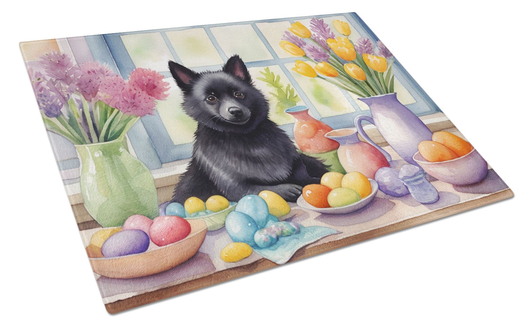 Glass Cutting Board featuring breed specific Schipperke artwork. Celebrate Easter with this Easter Cutting Board. Introduce your kitchen to the vibrant, large Decorative Glass Cutting Board from Caroline's Treasures. Crafted from resilient tempered glass, this board is not only a utilitarian necessity but also a colorful art piece. With its generous dimensions of 15 inches in height and 12 inches in length, it offers ample space for all your cutting needs. Every piece showcases captivating artwork from distinguished artists, bringing an aesthetic edge to your kitchen. Beyond its attractive design, this cutting board ensures your countertop stays pristine and unscathed, owing to its heat-resistant properties. Engineered with user convenience in mind, it features non-skid feet for stability, and rounded corners for additional safety. Its robust construction renders it virtually unbreakable, guaranteeing longevity. The board comes with protective feet bumpers, maintaining its position during use. This product is recommended to be hand washed only. Proudly printed and assembled in the United States, this cutting board exemplifies superior craftsmanship. With Caroline's Treasures' Decorative Glass Cutting Board, you're investing in a blend of functionality and artistic flair.