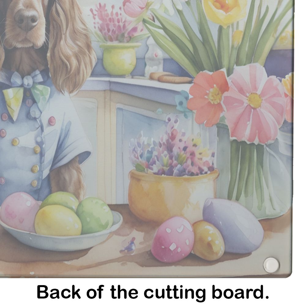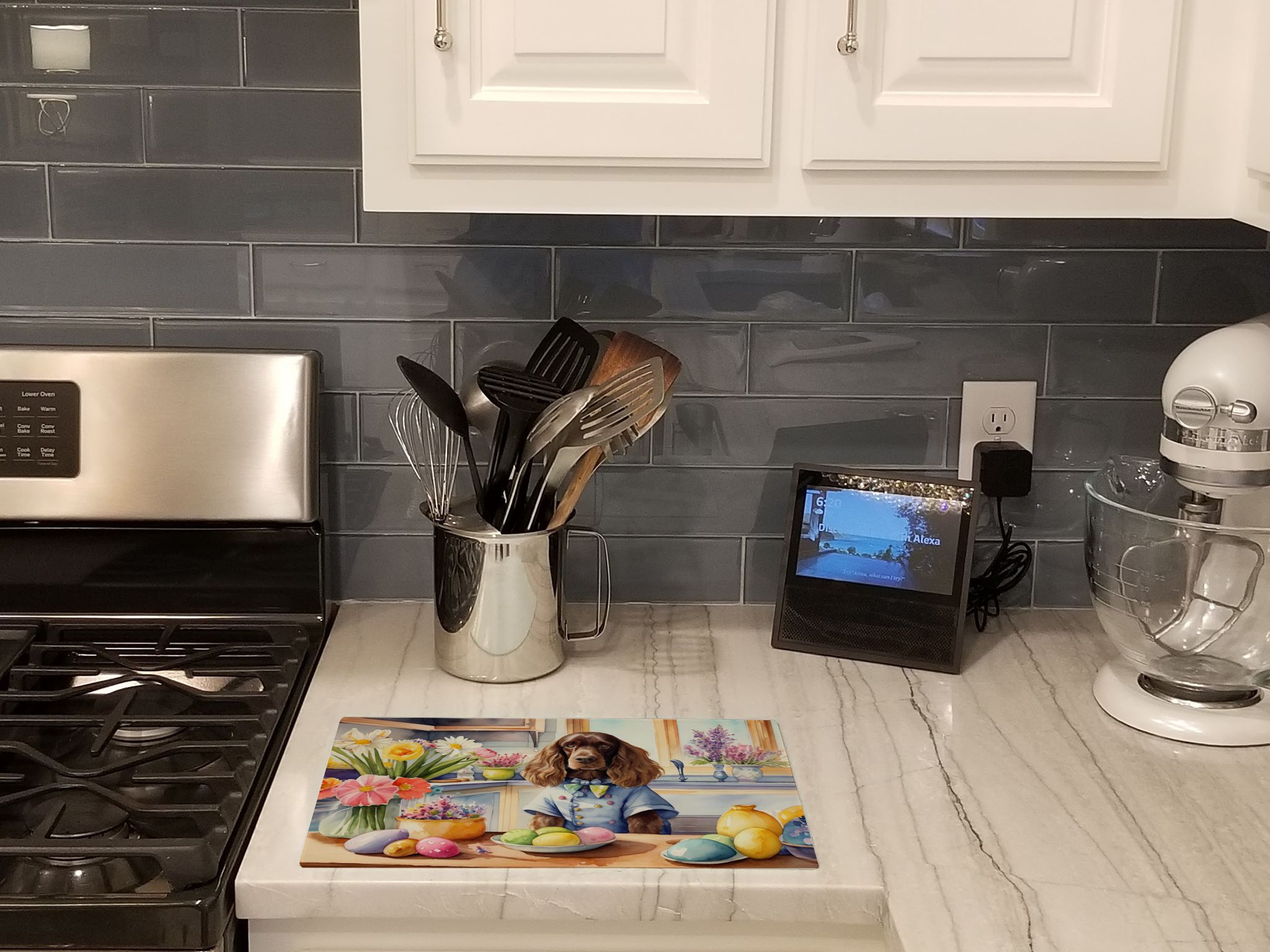 Glass Cutting Board featuring breed specific English Cocker Spaniel artwork. Celebrate Easter with this Easter Cutting Board. Introduce your kitchen to the vibrant, large Decorative Glass Cutting Board from Caroline's Treasures. Crafted from resilient tempered glass, this board is not only a utilitarian necessity but also a colorful art piece. With its generous dimensions of 15 inches in height and 12 inches in length, it offers ample space for all your cutting needs. Every piece showcases captivating artwork from distinguished artists, bringing an aesthetic edge to your kitchen. Beyond its attractive design, this cutting board ensures your countertop stays pristine and unscathed, owing to its heat-resistant properties. Engineered with user convenience in mind, it features non-skid feet for stability, and rounded corners for additional safety. Its robust construction renders it virtually unbreakable, guaranteeing longevity. The board comes with protective feet bumpers, maintaining its position during use. This product is recommended to be hand washed only. Proudly printed and assembled in the United States, this cutting board exemplifies superior craftsmanship. With Caroline's Treasures' Decorative Glass Cutting Board, you're investing in a blend of functionality and artistic flair.