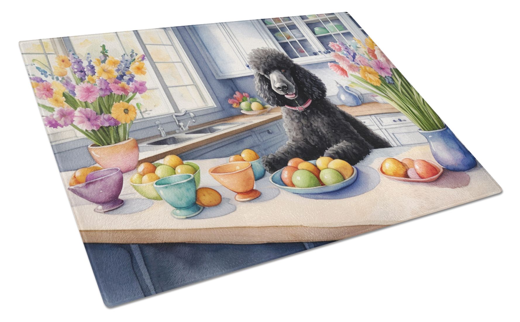Glass Cutting Board featuring breed specific Poodle artwork. Celebrate Easter with this Easter Cutting Board. Introduce your kitchen to the vibrant, large Decorative Glass Cutting Board from Caroline's Treasures. Crafted from resilient tempered glass, this board is not only a utilitarian necessity but also a colorful art piece. With its generous dimensions of 15 inches in height and 12 inches in length, it offers ample space for all your cutting needs. Every piece showcases captivating artwork from distinguished artists, bringing an aesthetic edge to your kitchen. Beyond its attractive design, this cutting board ensures your countertop stays pristine and unscathed, owing to its heat-resistant properties. Engineered with user convenience in mind, it features non-skid feet for stability, and rounded corners for additional safety. Its robust construction renders it virtually unbreakable, guaranteeing longevity. The board comes with protective feet bumpers, maintaining its position during use. This product is recommended to be hand washed only. Proudly printed and assembled in the United States, this cutting board exemplifies superior craftsmanship. With Caroline's Treasures' Decorative Glass Cutting Board, you're investing in a blend of functionality and artistic flair.