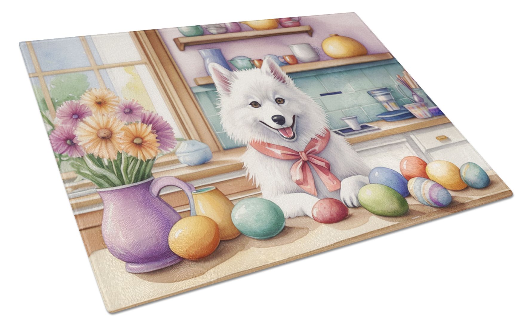 Glass Cutting Board featuring breed specific American Eskimo artwork. Celebrate Easter with this Easter Cutting Board. Introduce your kitchen to the vibrant, large Decorative Glass Cutting Board from Caroline's Treasures. Crafted from resilient tempered glass, this board is not only a utilitarian necessity but also a colorful art piece. With its generous dimensions of 15 inches in height and 12 inches in length, it offers ample space for all your cutting needs. Every piece showcases captivating artwork from distinguished artists, bringing an aesthetic edge to your kitchen. Beyond its attractive design, this cutting board ensures your countertop stays pristine and unscathed, owing to its heat-resistant properties. Engineered with user convenience in mind, it features non-skid feet for stability, and rounded corners for additional safety. Its robust construction renders it virtually unbreakable, guaranteeing longevity. The board comes with protective feet bumpers, maintaining its position during use. This product is recommended to be hand washed only. Proudly printed and assembled in the United States, this cutting board exemplifies superior craftsmanship. With Caroline's Treasures' Decorative Glass Cutting Board, you're investing in a blend of functionality and artistic flair.