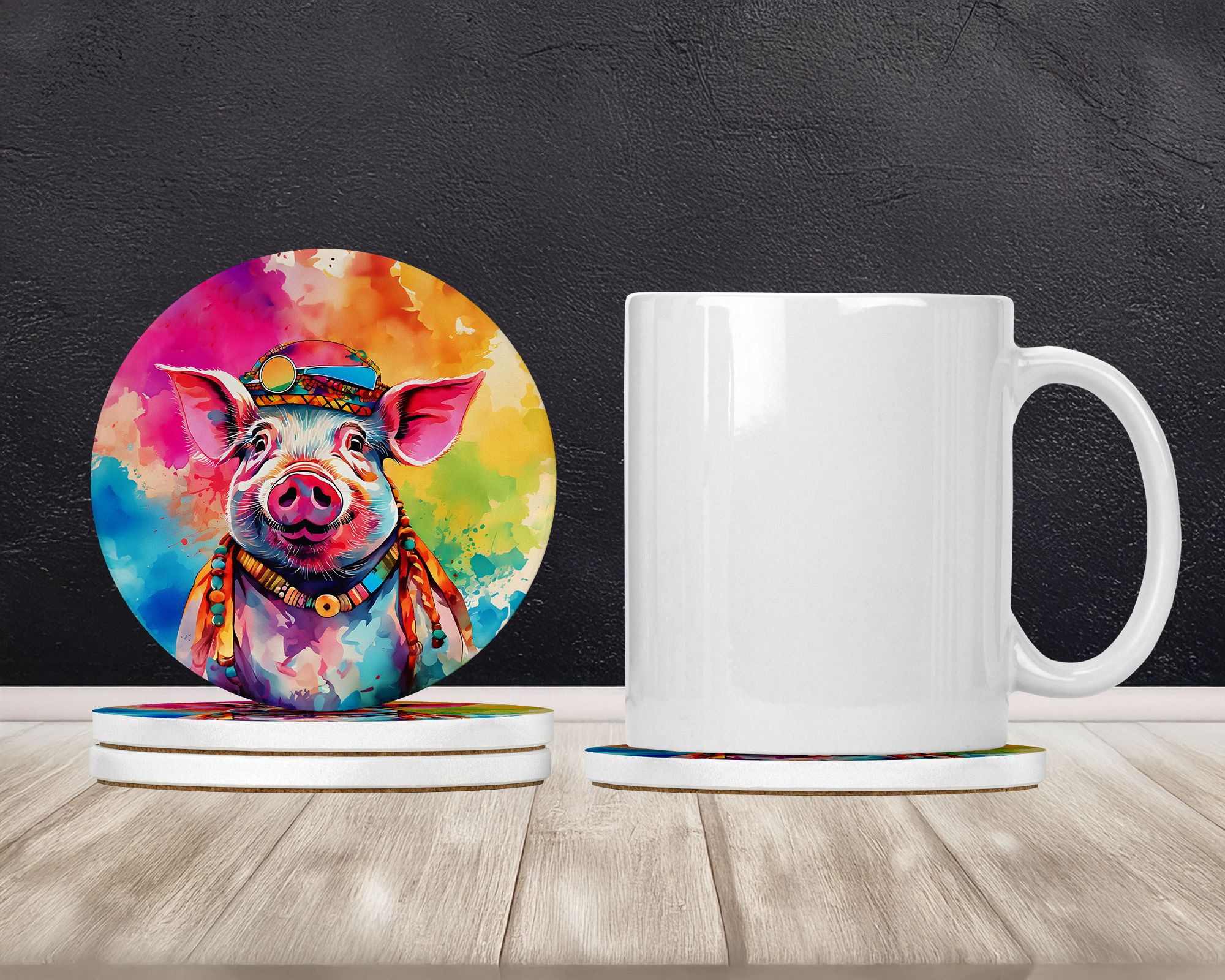 Hippie Animal Pig Large Sandstone Coasters Pack of 4 Absorbent Round Coasters Decor Gifts for Men or Women, 4 in, Multicolor