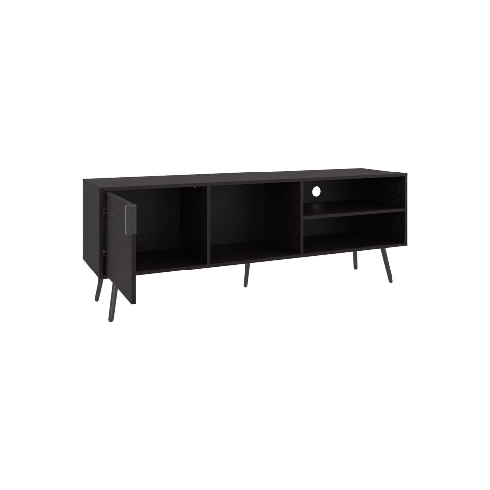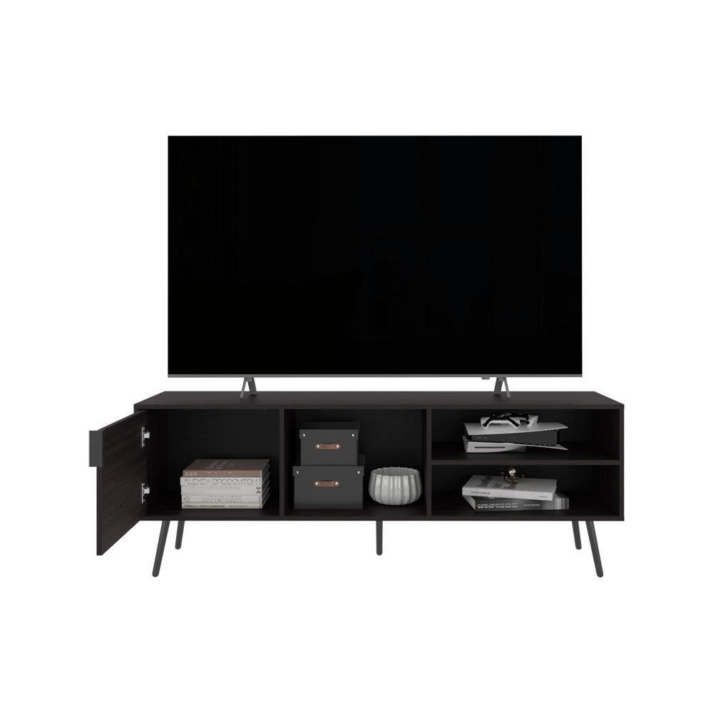 Transform your living room with the stylish and functional Long Beach TV Stand. Crafted from high-quality black manufactured wood, this TV stand features a minimalist design with clean lines and a versatile aesthetic that complements any space. Equipped with a spacious storage cabinet and open shelving, it offers ample room for your entertainment systems, books, or decor. Its sturdy legs provide a stable base, while the back panel includes a cable management hole to keep wires organized and out of sight. Whether used for a home theater setup or as a media console, this TV stand combines style, practicality, and durability.Dimensions: Height: 22.8'Width: 63' Depth: 15.3'