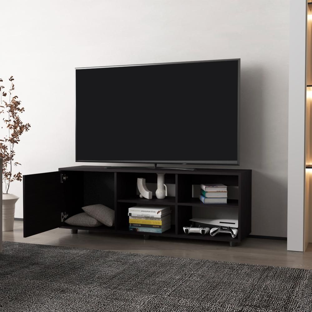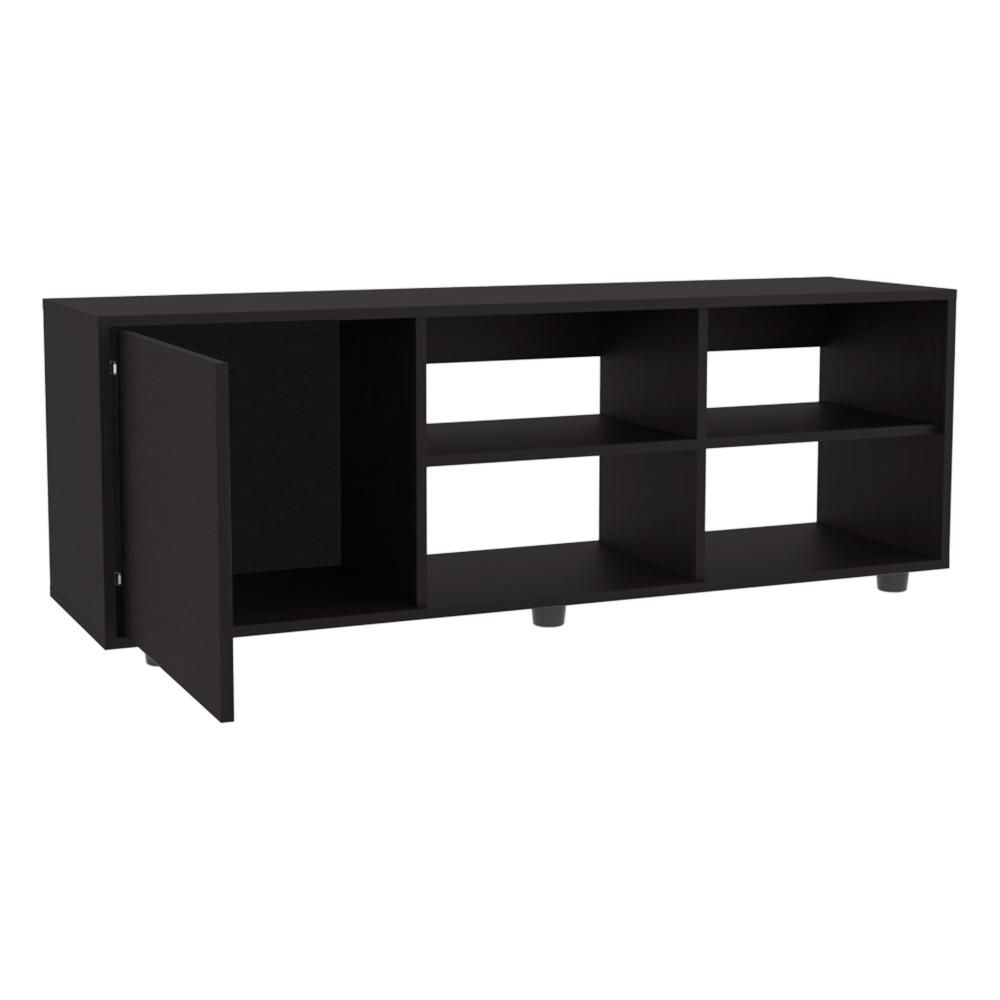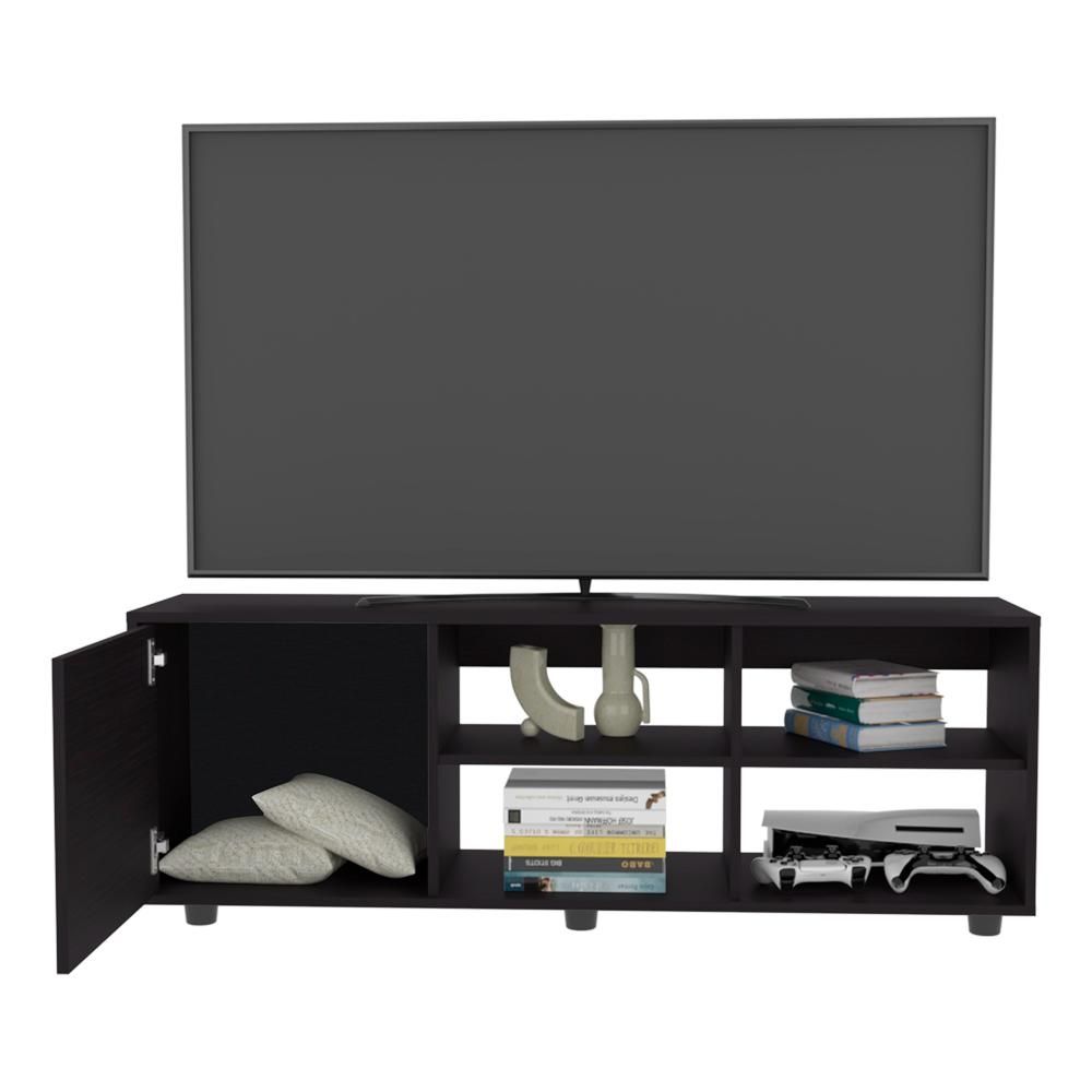 Transform your living room with the elegant Roseland Tv Stand, which combines functionality with contemporary style. Crafted from durable black manufactured wood, this stand features a smooth sliding door and multiple open shelves to display or conceal your media essentials. Ideal for TVs up to 50", it is perfect for organizing electronics, books, and decorative items while maintaining a sleek and minimalist aesthetic. Its compact design fits effortlessly into any living space.Dimensions: Height: 18.4'Width: 51.2' Depth: 13.7'