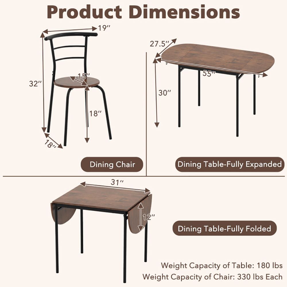 1.Drop Leaf Table: This dining set features a 55" drop leaf tabletop enabling quick adjustments according to space needs. The 3 configurations (no leaves, single leaf and 2 leaves) make the dining set ideal for smaller dining areas or apartments.