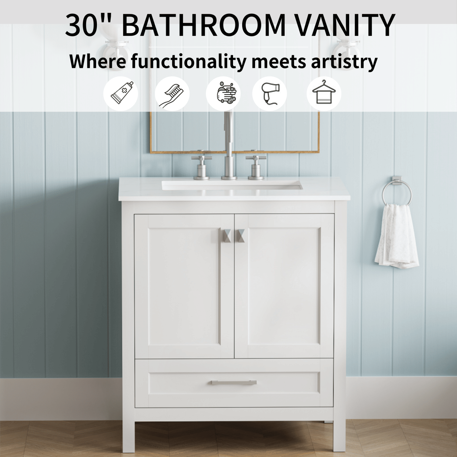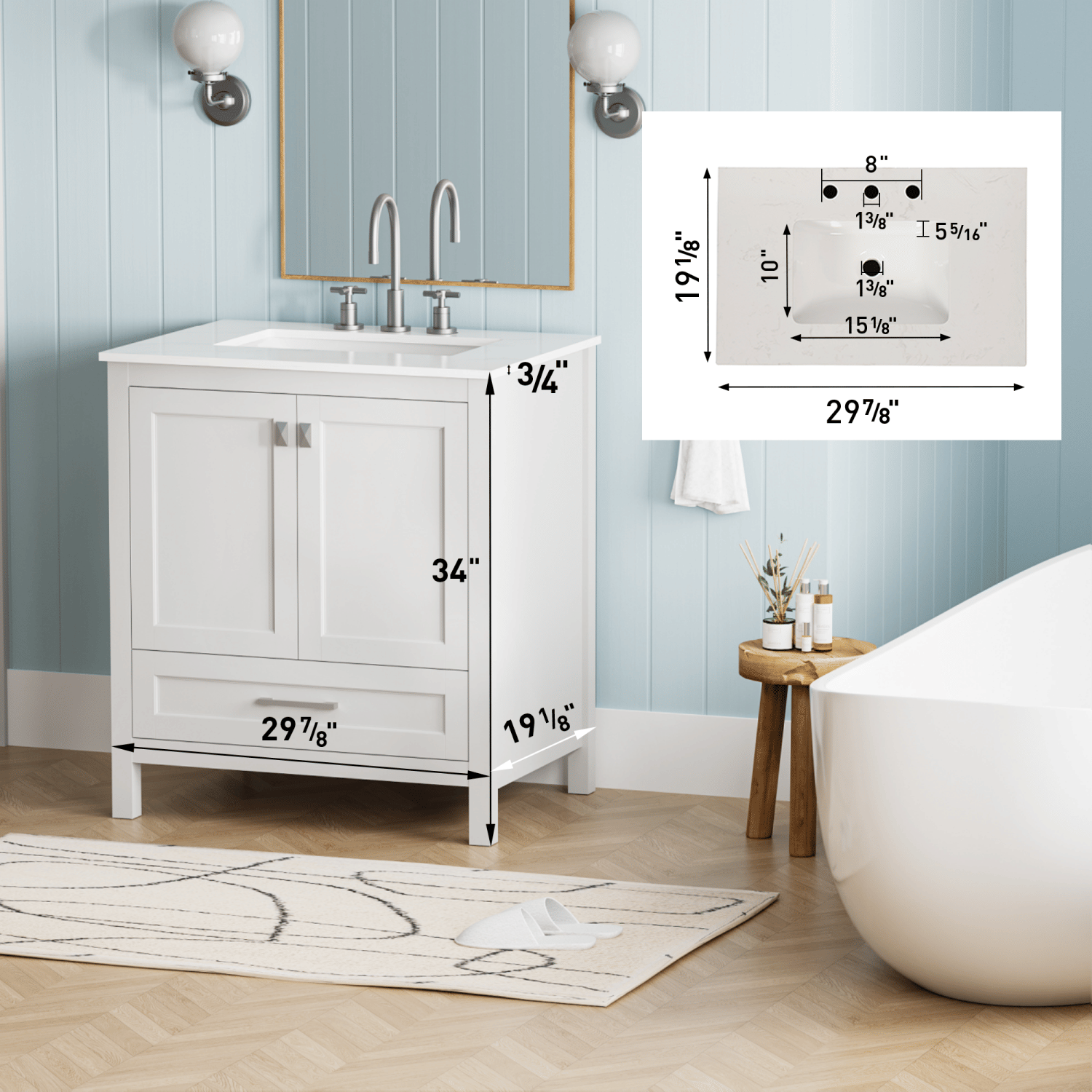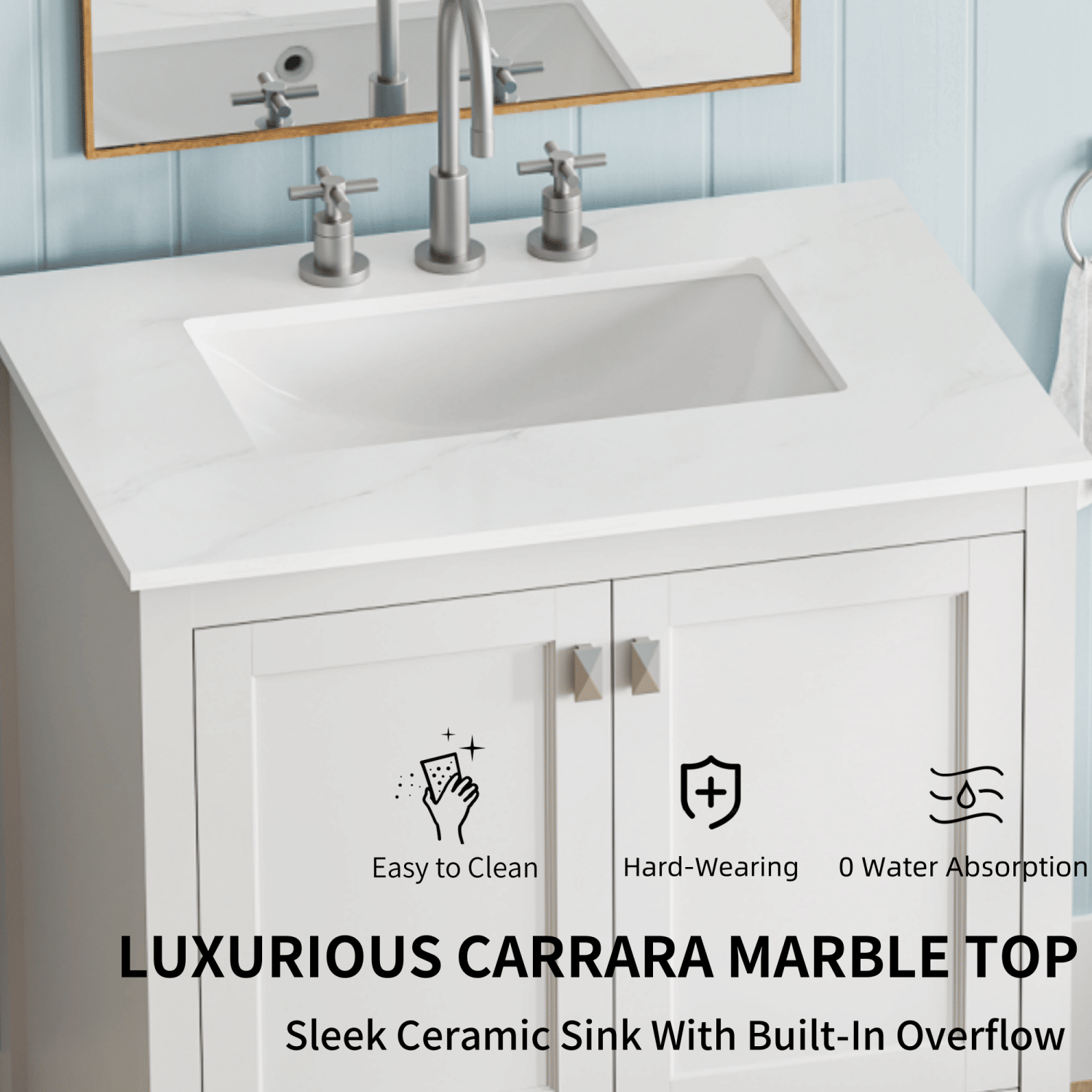 30" Bathroom Vanity with Sink Combo, Fully Assembled Bathroom Sink Cabinet with Marble Countertop, White 24V03-30WH