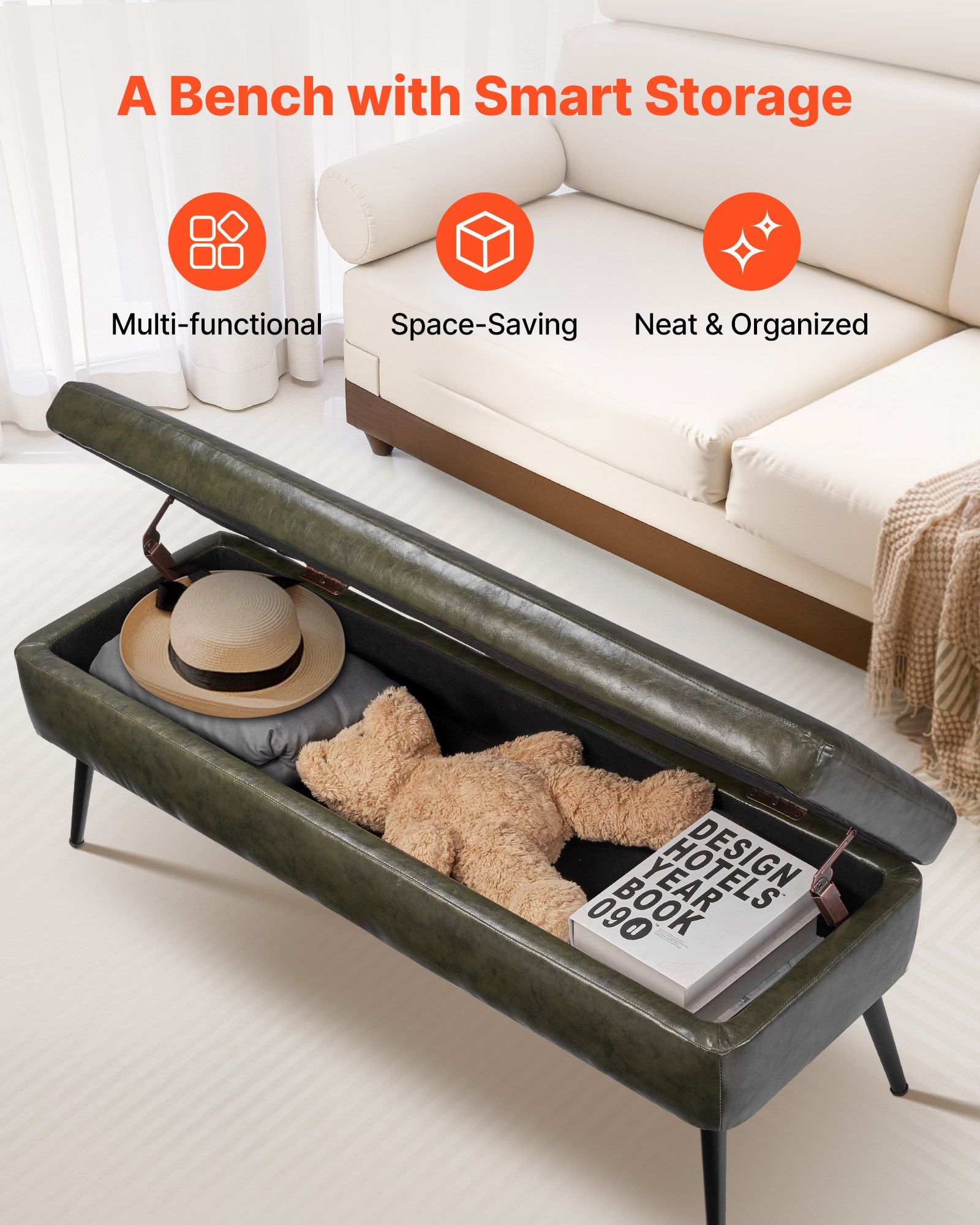 4.Smooth PU Leather: Wrapped in premium PU leather with a silky texture and refined stitching. Water-resistant and easy to wipe clean-great for busy homes. Our bed storage bench adds a modern, refined touch to your bedroom décor