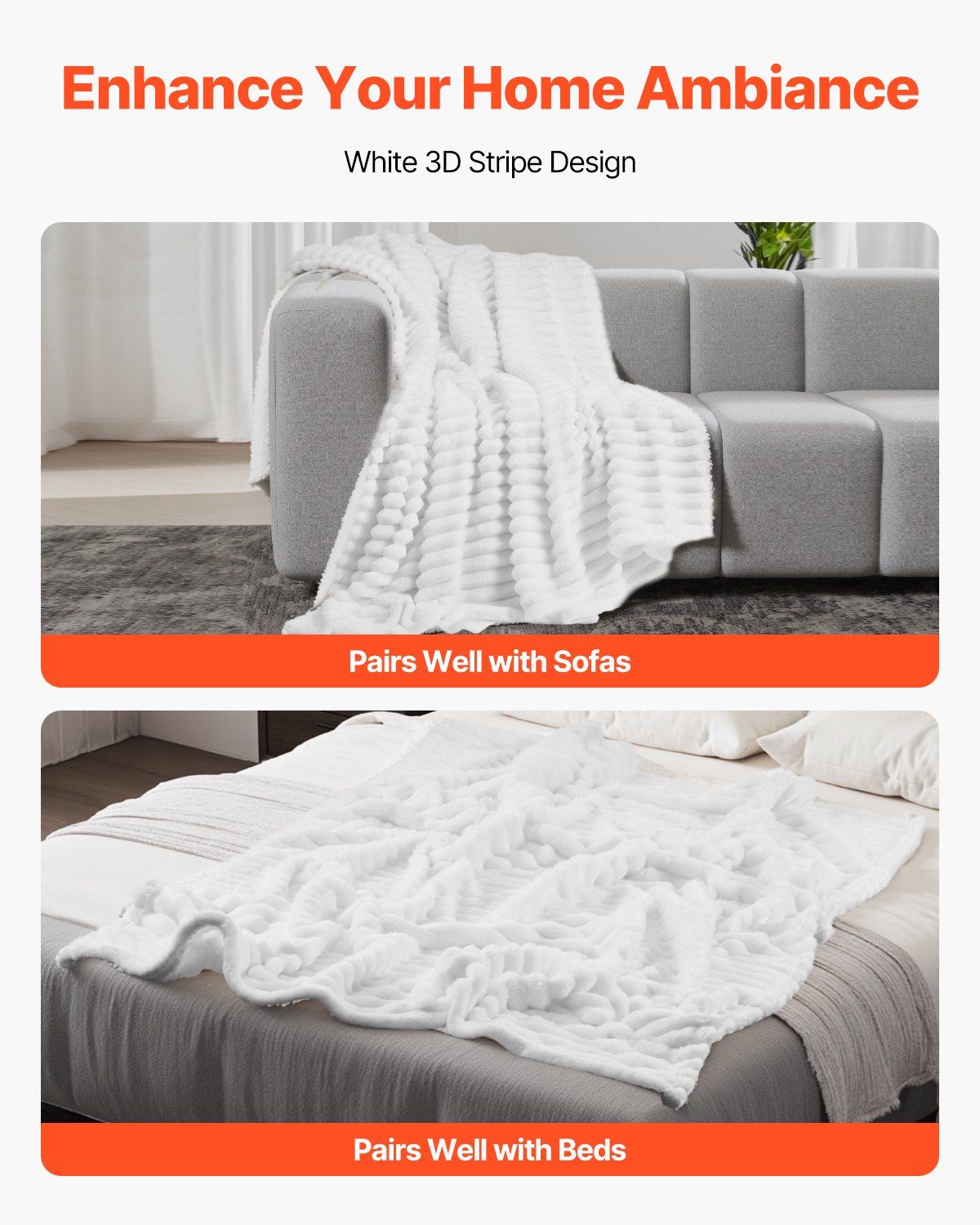 3.Simple and Stylish Appearance: The classic white color and textured striped design effortlessly complement any home décor style, creating a warm, cozy, and inviting atmosphere in any room. This blanket brings a sense of belonging and a lively touch to your home