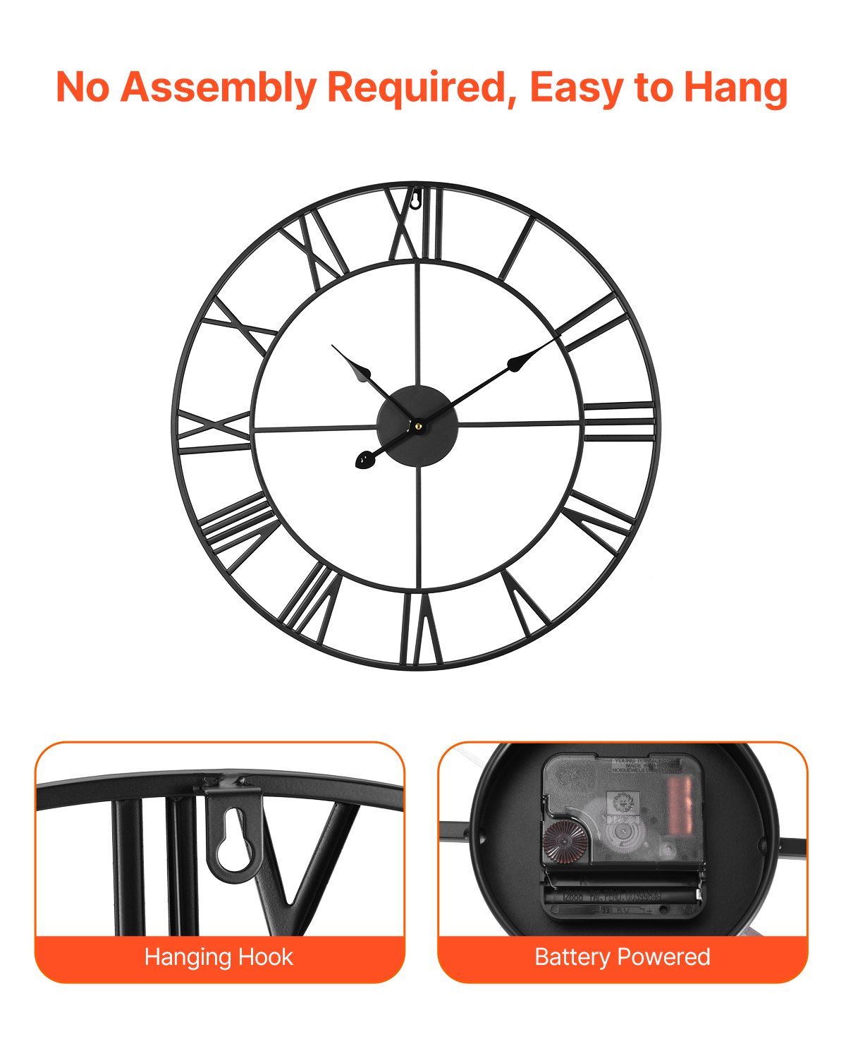 1.Easy to Read: This 24" extra-large wall clock features clear Roman numerals, smooth-moving hands, and a hollow dial, ensuring quick and accurate time reading, day or night.