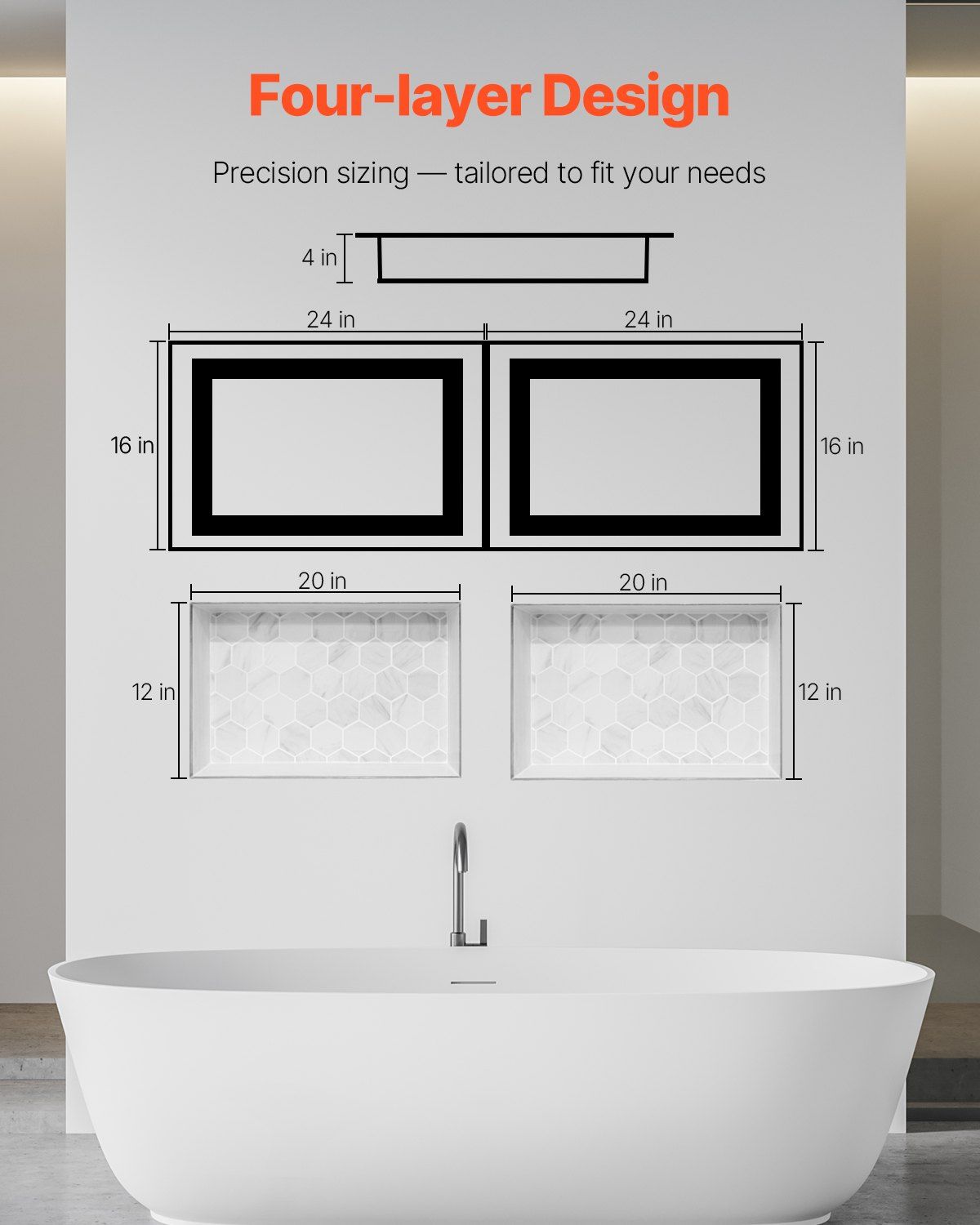4.Easy Installation: Comes with an accessory kit for horizontal or vertical recessed installation. Just follow these steps: Step 1: Determine the required height and draw a horizontal line on the base layer. Step 2: Cut along the line and get rid of the top base layer. Step 3: Use waterproof sealant to attach the niche to the studs and seal the joints. Step 4: Apply mortar and affix chosen tiles.