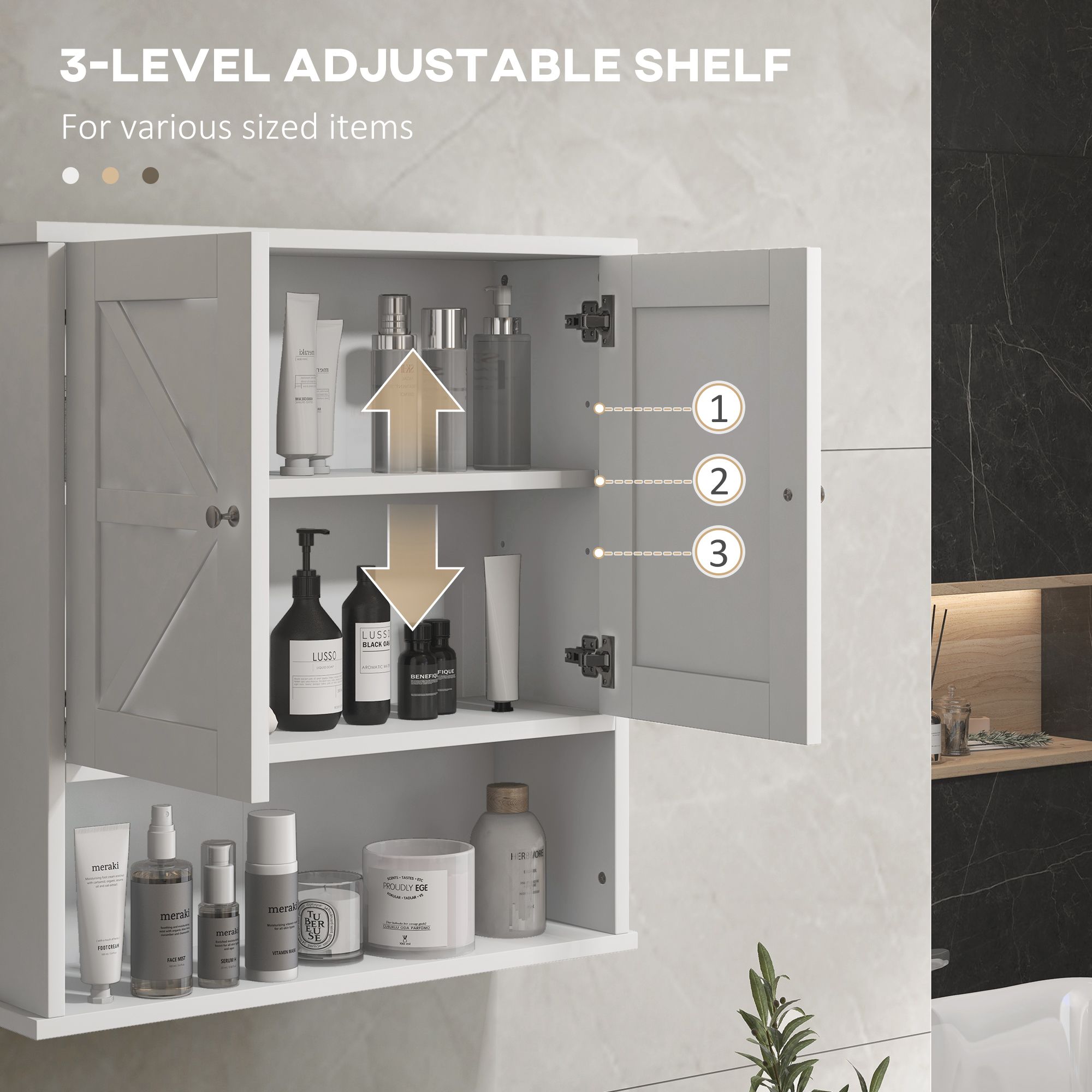 2.- Wall-Mounted Design: Say goodbye to cluttered countertops and enjoy the convenience of having your essentials within reach. Easy to attach to the wall, maximize the storage space in your bathroom with this above toilet cabinet.