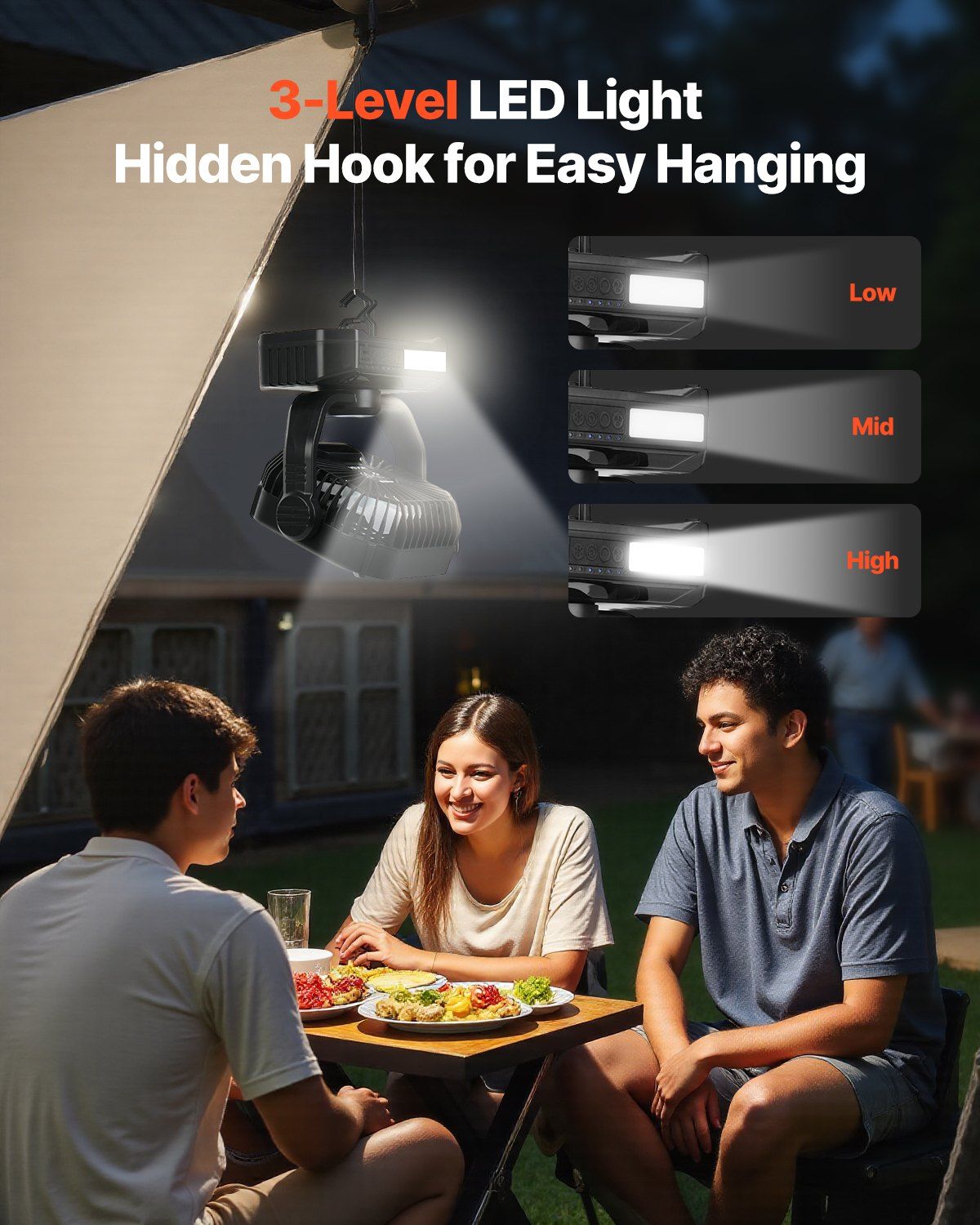 4.3-Level LED Lighting: Hidden hook design for convenient hanging, saving space while meeting outdoor lighting needs. This solar portable fan serves as both a fan and a light source for all your camping and outdoor adventures