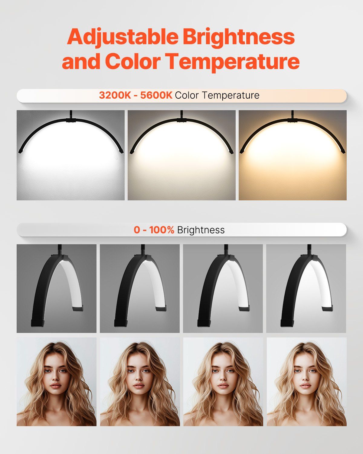 2.Adjustable Brightness and Color Temperature: Our half moon floor lamp provides adjustable color temperatures from 3200K to 5600K and stepless brightness control, allowing you to create a personalized lighting environment. It ensures a soft, comfortable, and eye-friendly light source