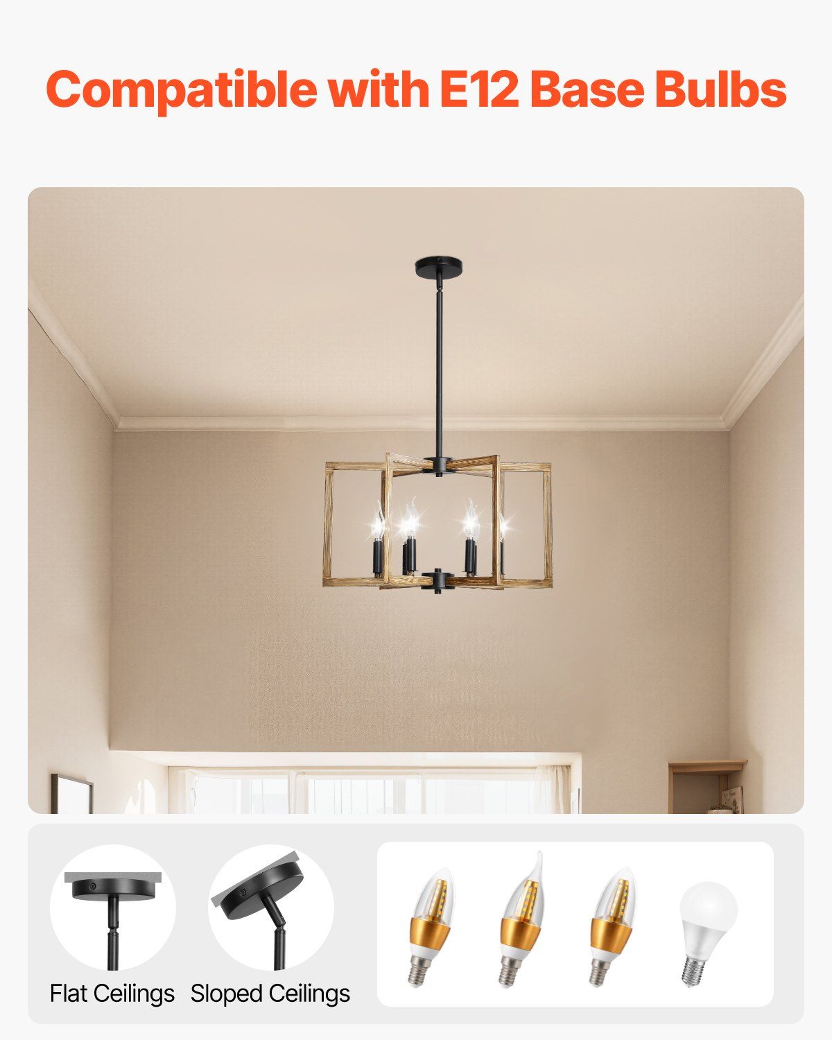 Compatible with E12 bulb sockets, this hanging chandelier gives you the flexibility to choose from various bulbs to match your mood and lighting needs—no more worrying about compatibility!