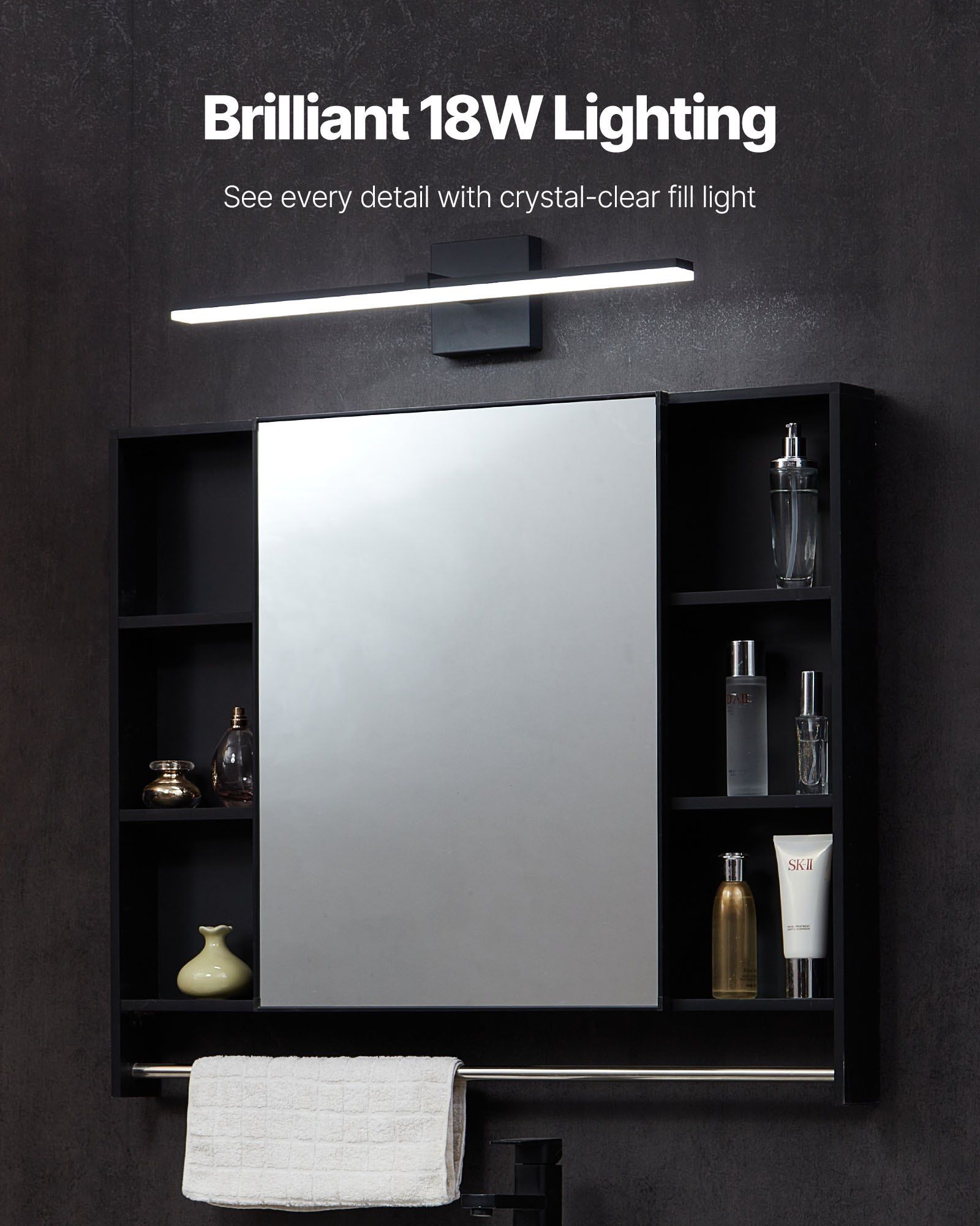 1.High Brightness Illumination: Our 18W bathroom light bar delivers bright, clear illumination, ensuring every detail is visible while you apply makeup. Achieve a flawless look with ease