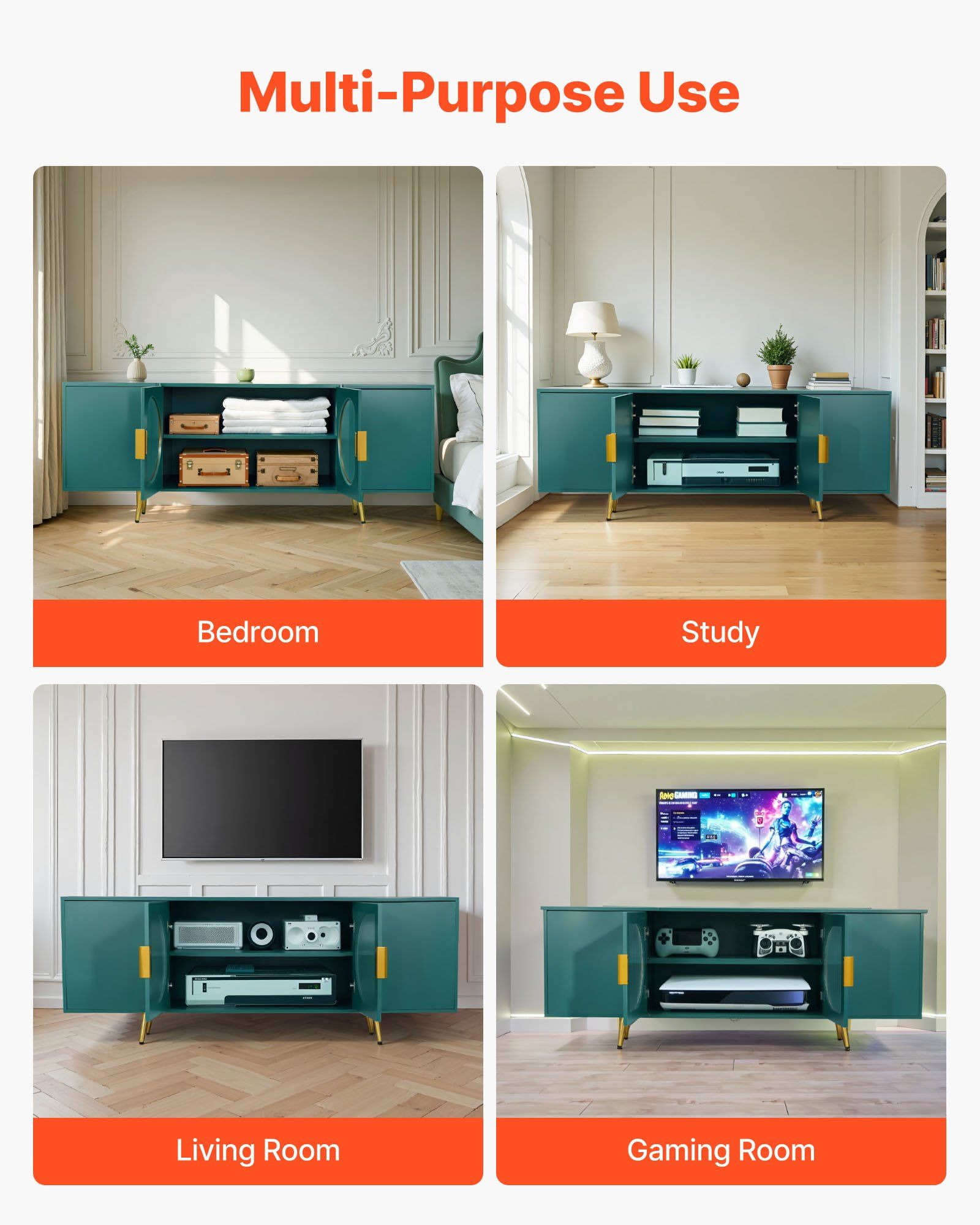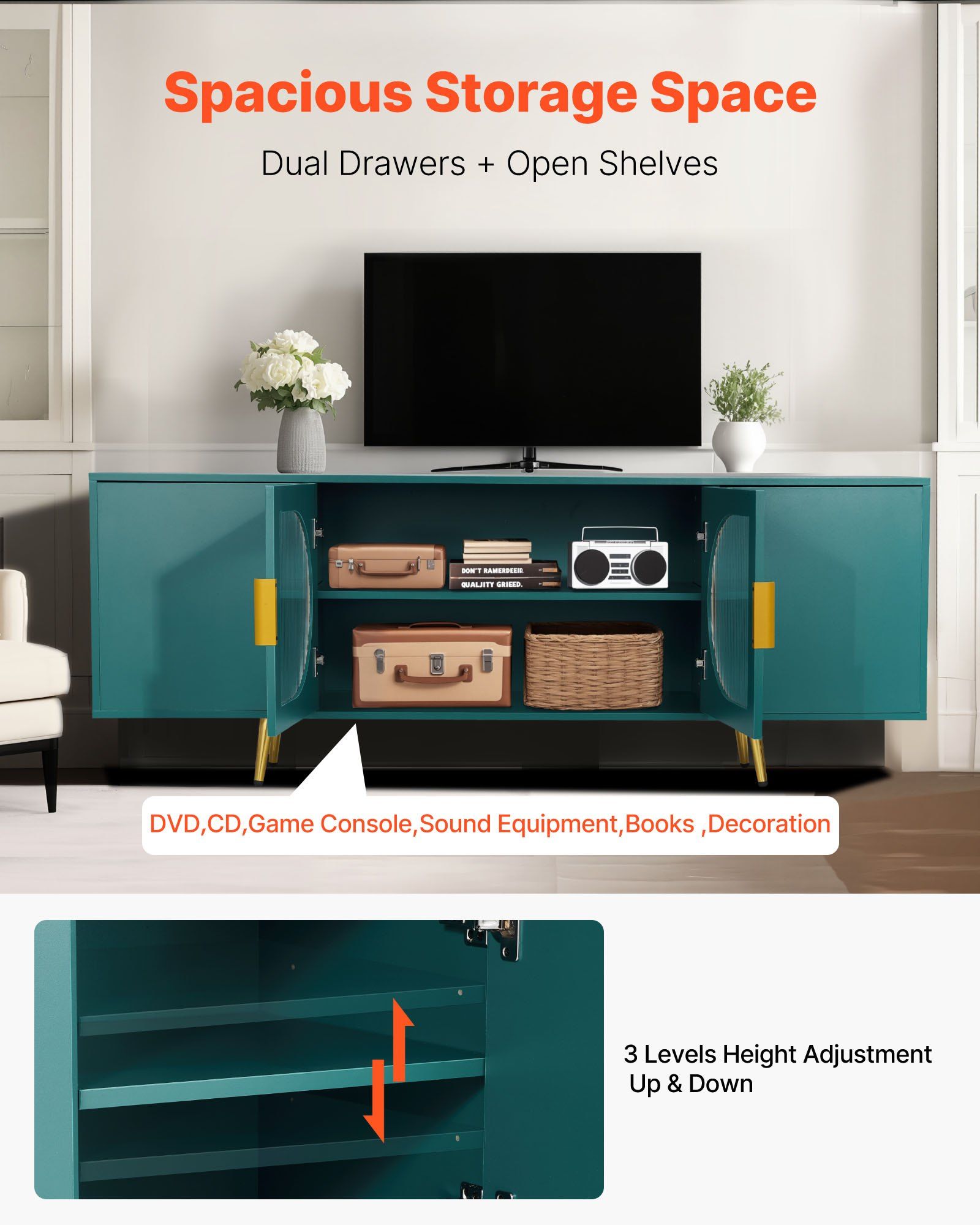 2.Flexible Storage: With adjustable-height shelves, the TV cabinet storage easily accommodates devices of various sizes. Beyond holding a TV, the cabinet and countertop can store decorations, models, books, magazines, DVD/CD collections, gaming equipment, and more to adorn your living space