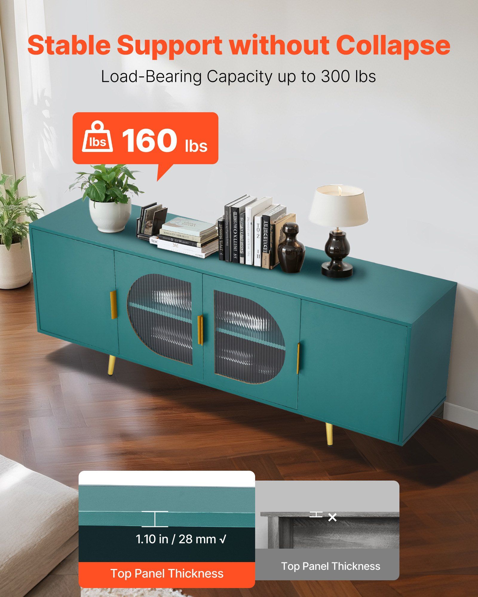 Constructed from premium particleboard and tempered glass for long-lasting durability: 0.59 in / 15 mm thick shelves + P2 particleboard frame ensure stability. Supports up to 160 lbs / 72.57 kg, securely holding your TV and devices.