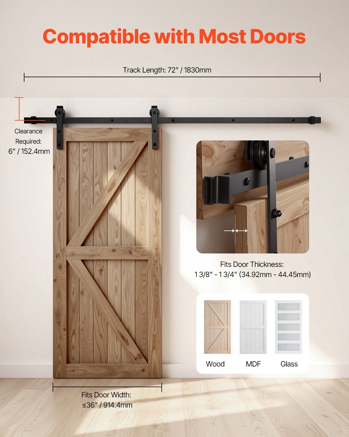 4.Fit Most Doors: Our sliding door hardware kit is compatible with doors that are 1-3/8 to 1-3/4 inches thick (34.92 mm ~ 44.45 mm), and up to 36-inch / 914.4 mm wide. Ideal for wood, glass, and MDF barn doors.