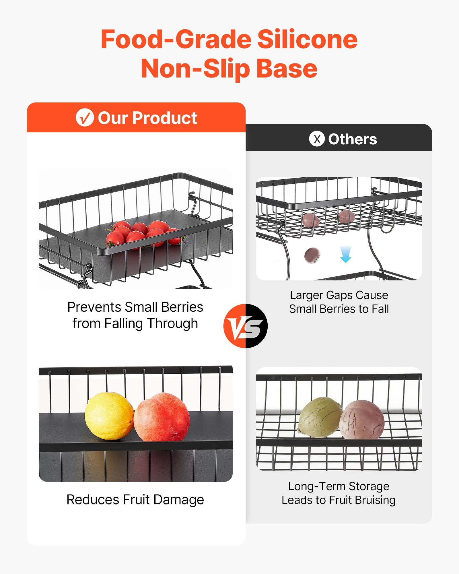 Equipped with food-grade silicone pads to against marks even after long-term fruit storage. Side hooks allow hanging additional items, and round feet at the bottom provide stable, non-slip placement.