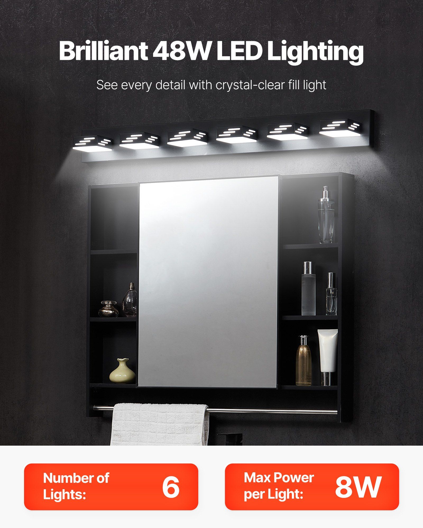 1.High Brightness Illumination: With 8W six-light, this 48W LED modern vanity lights fixtures deliver high brightness and clear fill light. Illuminate every detail and effortlessly create a flawless makeup look