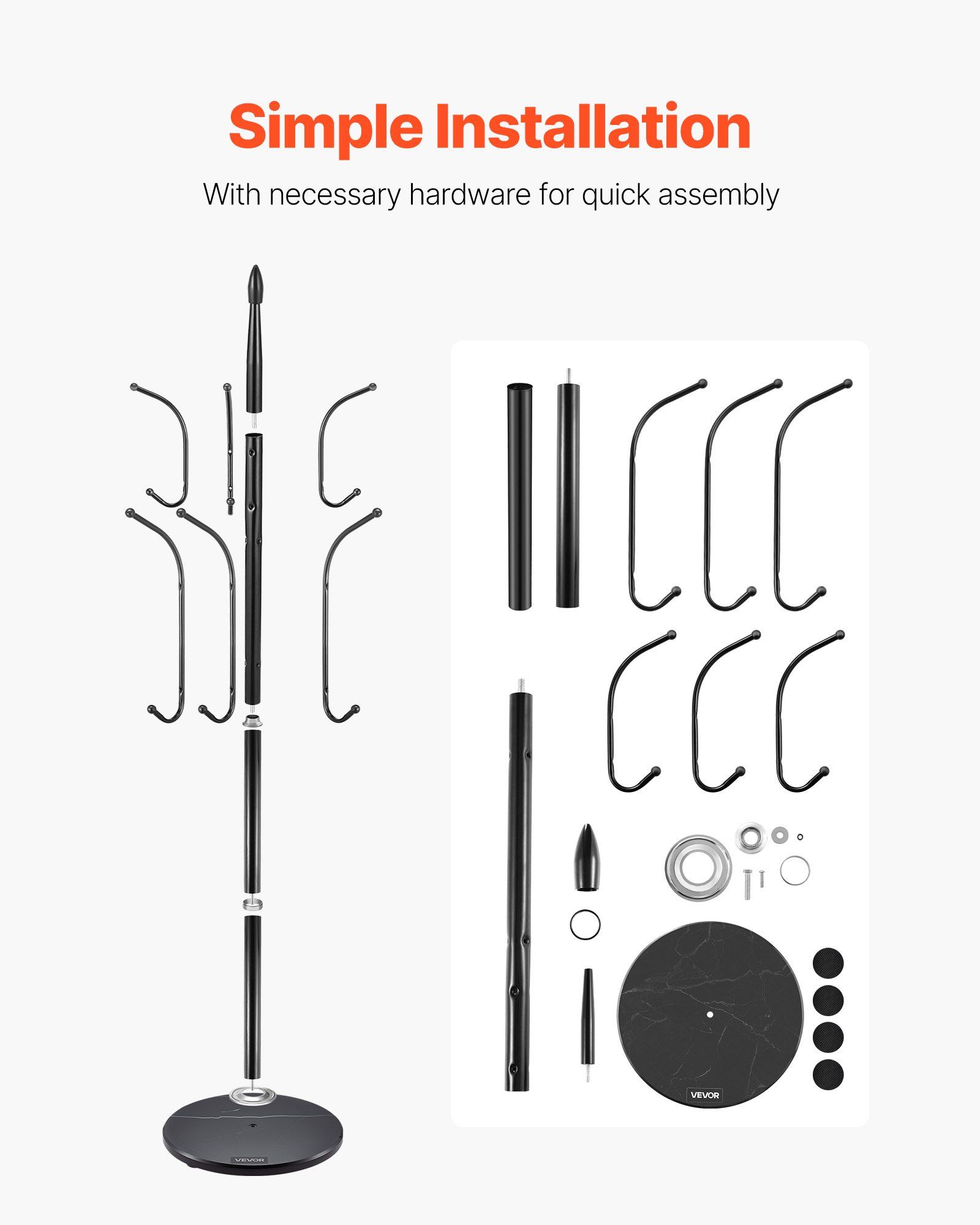 1.Strong Load Capacity: Create a tidier home space with VEVOR coat rack. It features a large marble base, 6 hooks, and a thickened carbon steel main rod. Each hook holds up to 6.6 lbs (3 kg), with a total capacity of 40 lbs (18 kg), providing stable support for hanging coats, hats, bags, and more