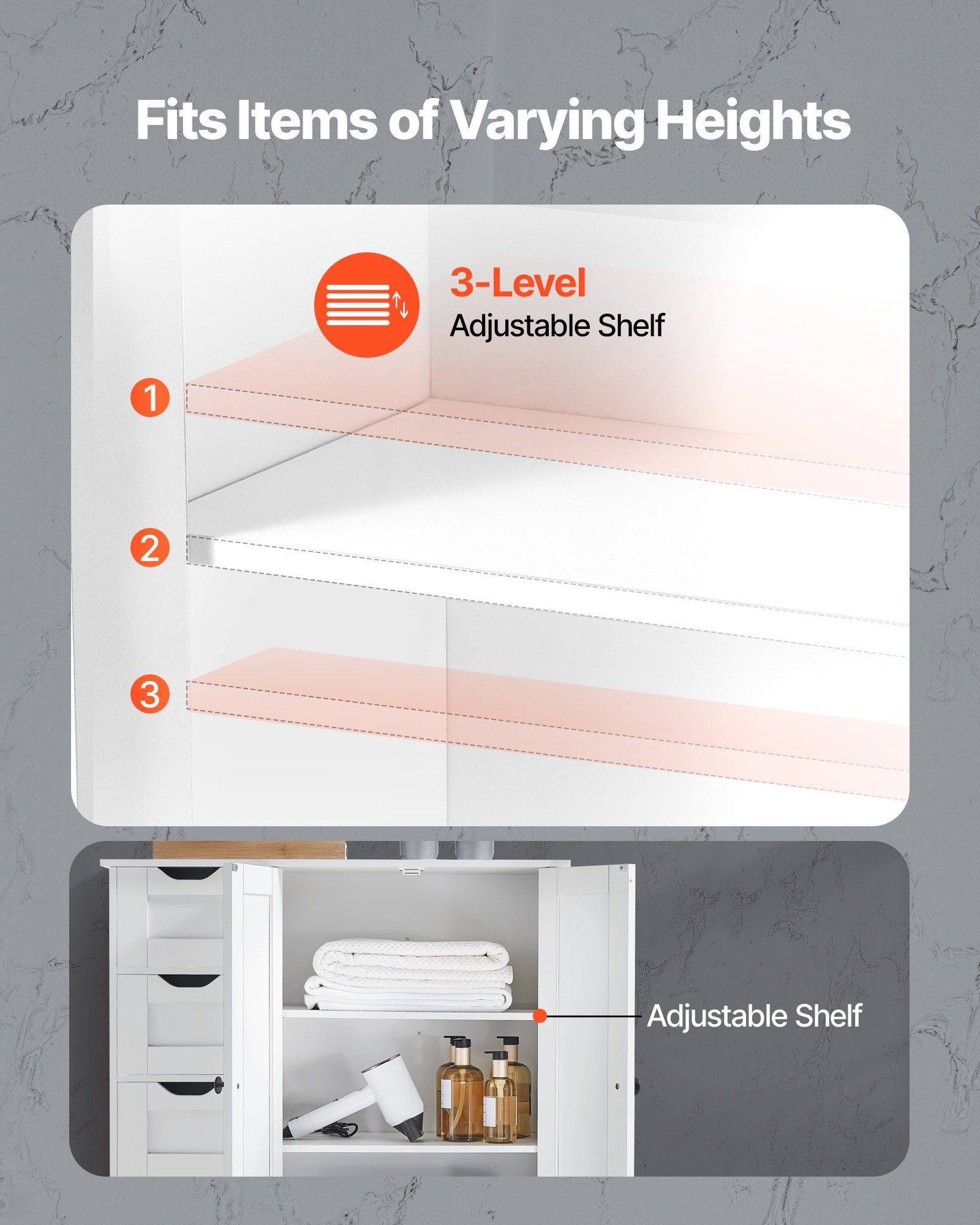 2.Adjustable Shelf Heights: Equipped with pre-drilled holes, the bathroom floor storage cabinet provides three height levels to customize the upper shelf spacing. It is ideal for storing items of different sizes with ease