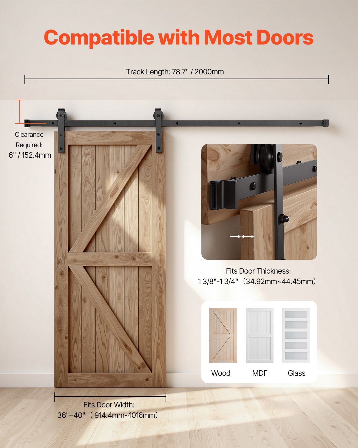 4.Fit Most Doors: Our sliding door hardware kit is compatible with doors that are 1-3/8 to 1-3/4 inches thick (34.92 mm ~ 44.45 mm), and 36 to 40 inches wide. Ideal for wood, glass, and MDF barn doors.