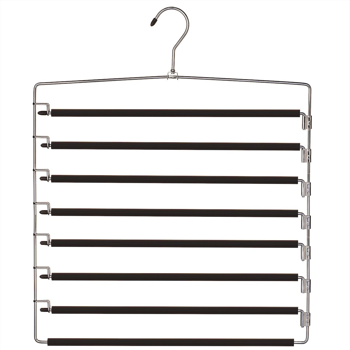 The 8-tier was designed with exceptional space saving in mind. Though its primary use is the ability to hang 8 pants, it can be used to organize various other items such as skirts, shorts, leggings, undergarments, ties, scarfs, towels, and masks, amongst many other things. This is an essential space saver for small closets. The grooved non-slip padded swing arms provide easy access to your garments while protecting even your most delicate garments from unwanted creasing and stop them from sliding off the hanger. The ends of each arm have also been capped to protect your clothes. Made with a heavy-duty 4 mm chrome steel frame to ensure that the hanger can hold garments on all 8 bars at the same time. The hanger's use is not limited to your closet. Use it in the bathroom for towels. In the pantry for dish cloths and aprons. In the laundry room to hang dry garments. In the garage for rags and cloths.